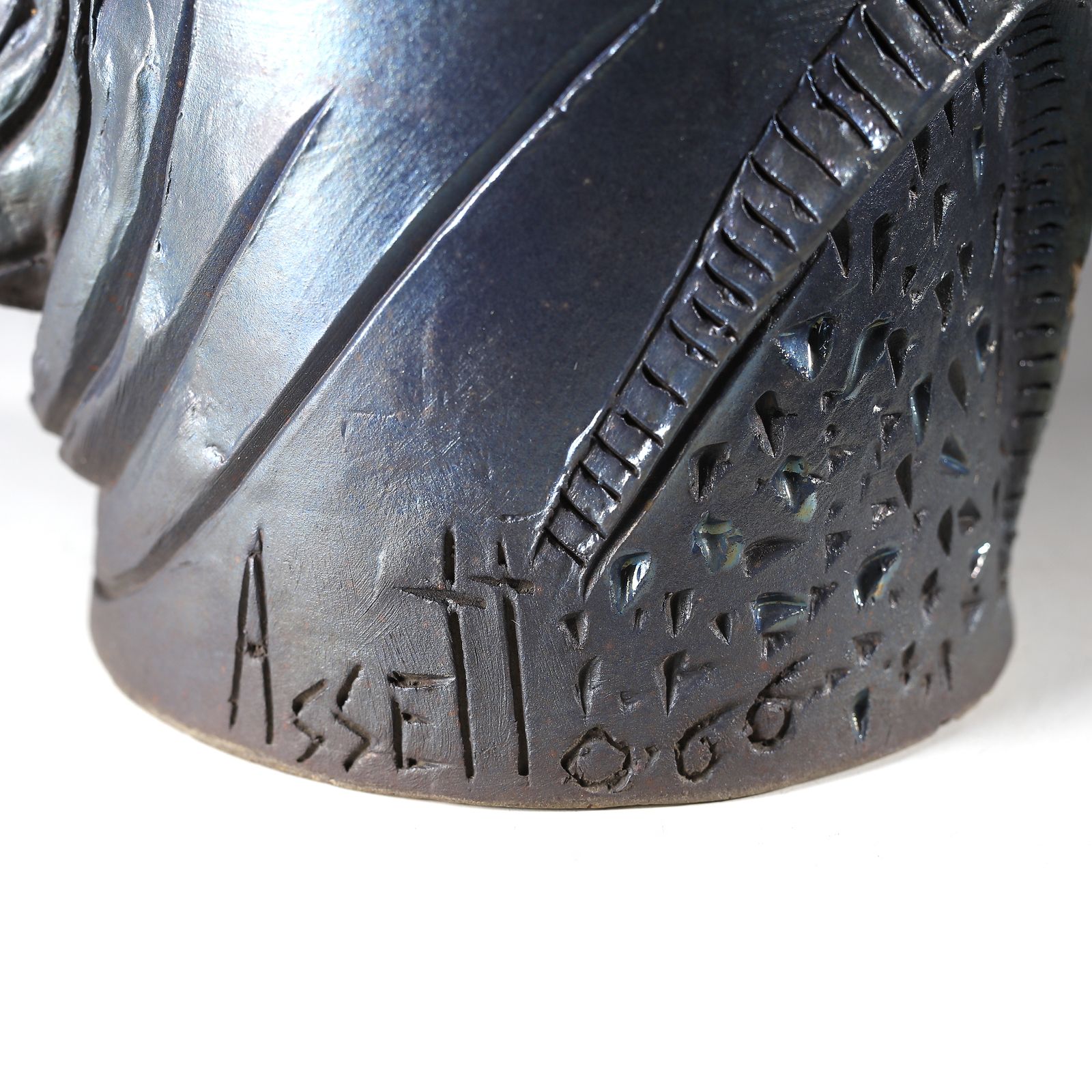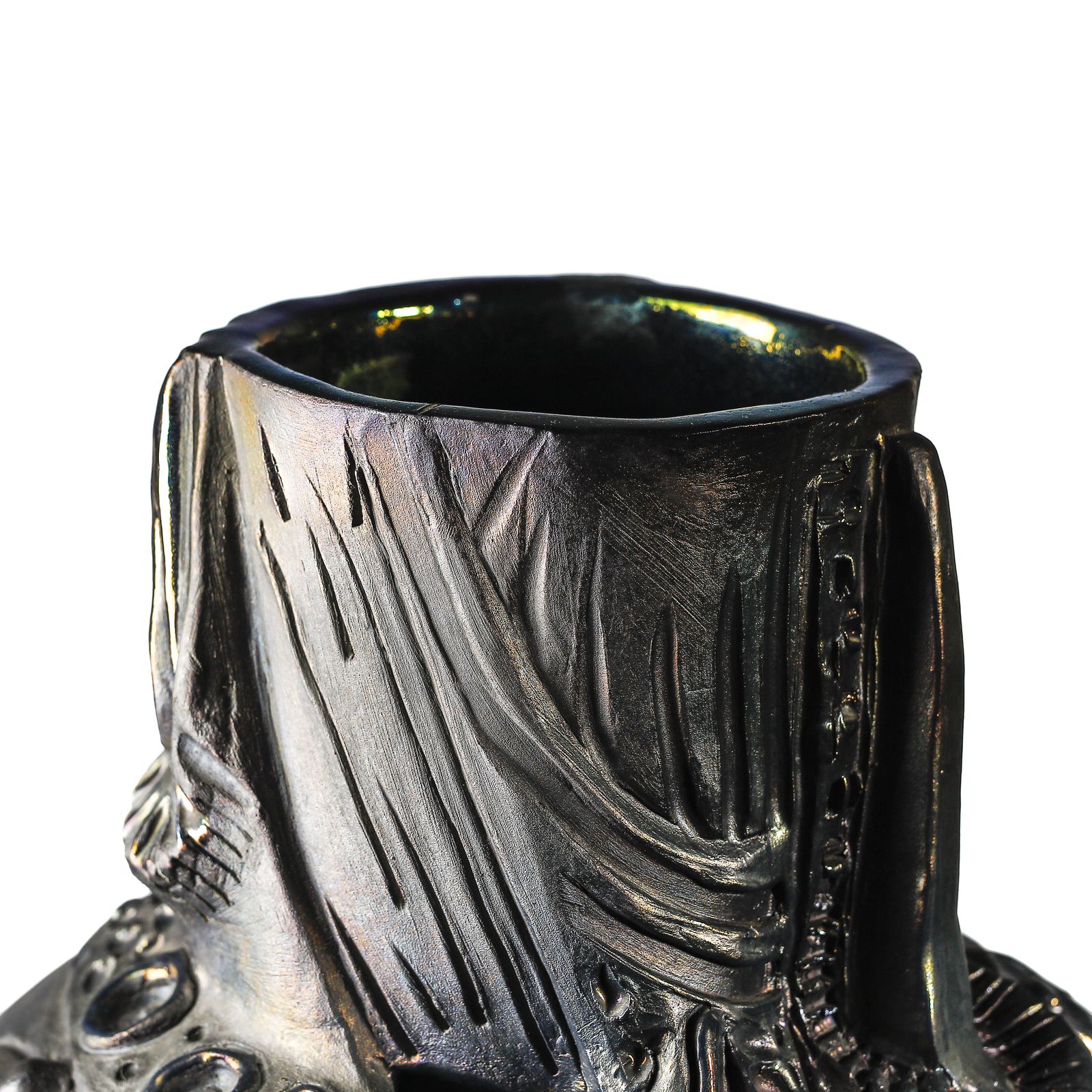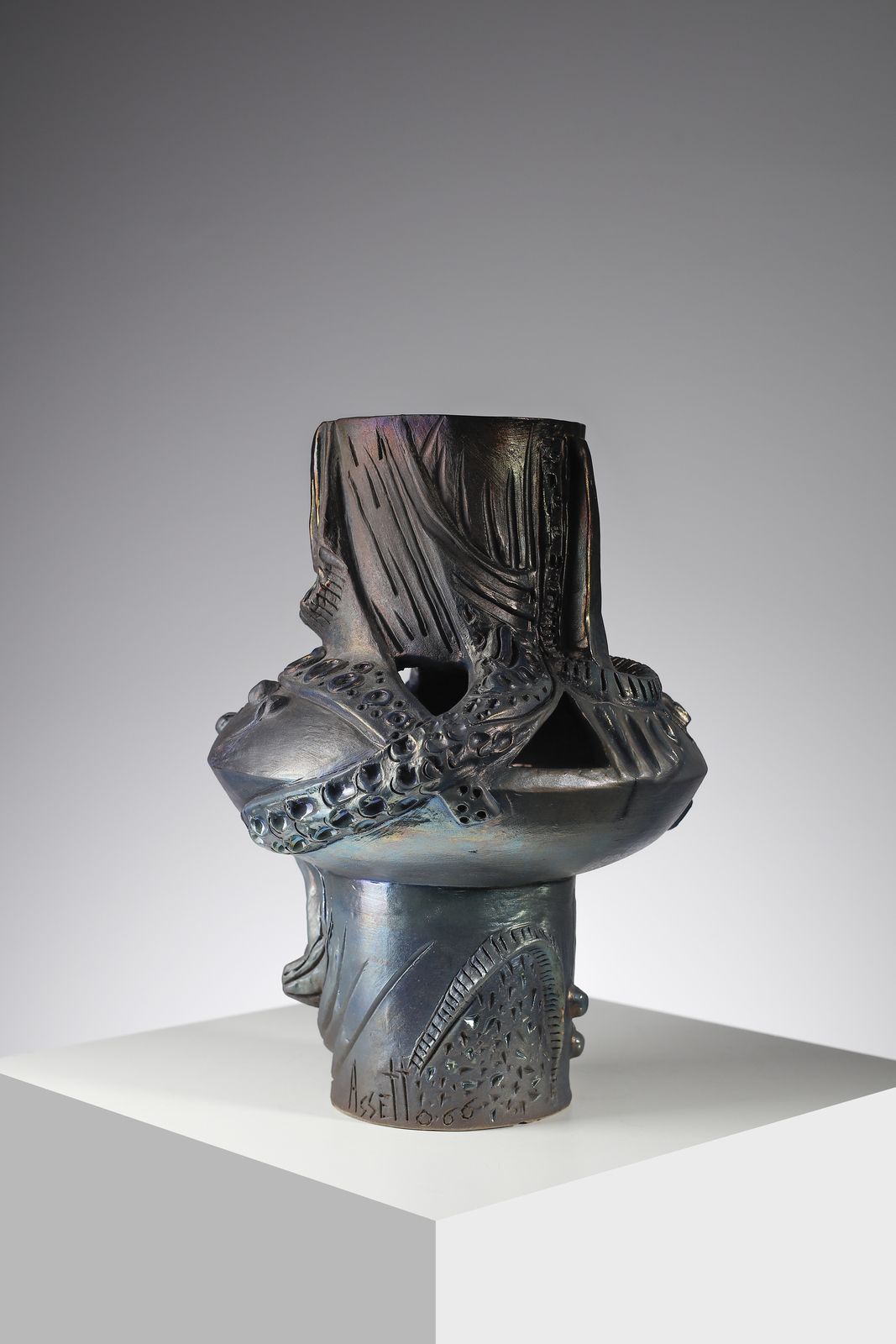 Vaso cilindrico con parte centrale panciuta decorato con motivi astratti a rilie [..]