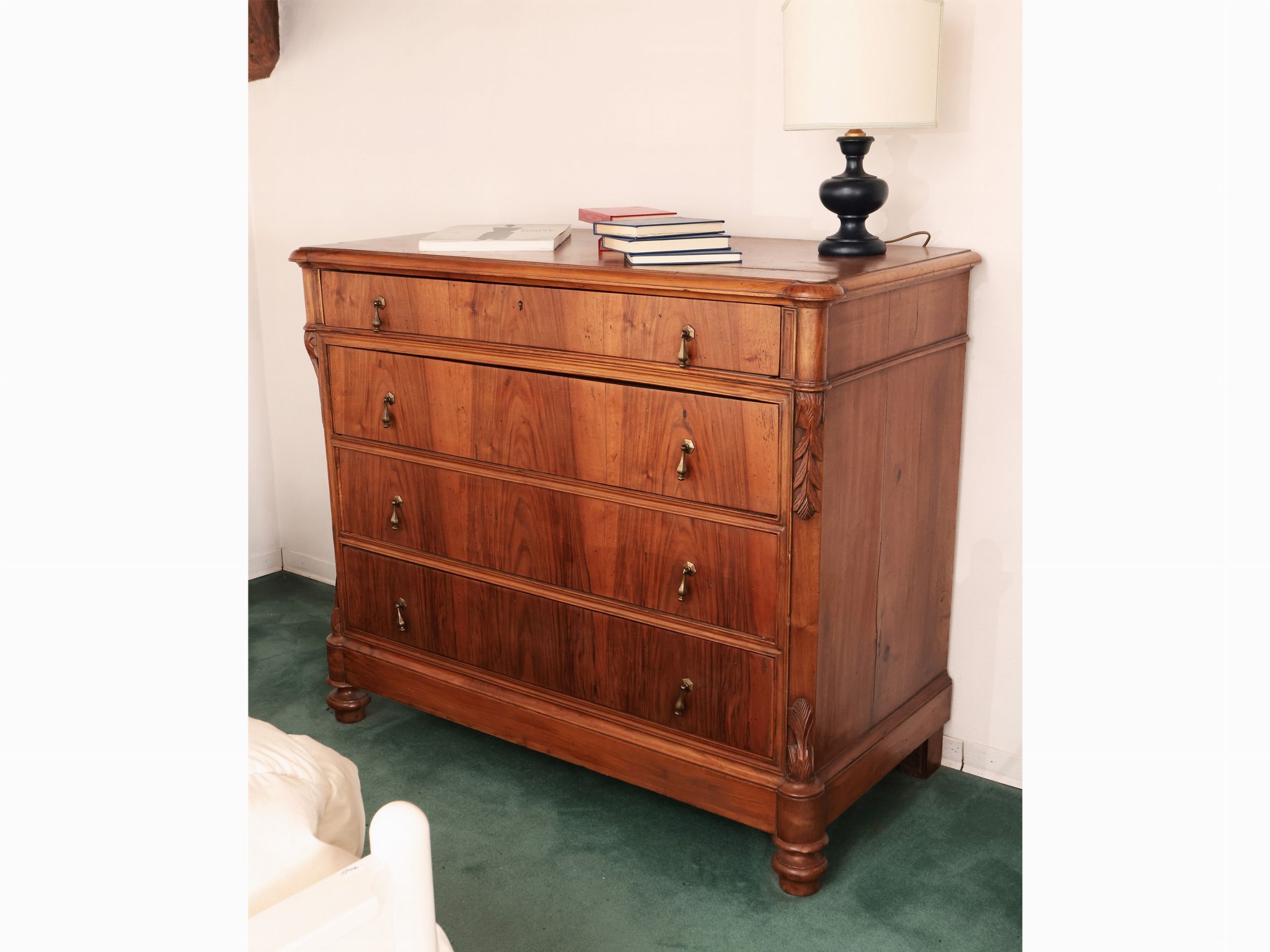 seconda metà del XIX secolo piano con angoli arrotondati, quattro cassetti su fronte dritto tra lesene a colonna intagliate con foglie d'acanto, piedi a cipolla