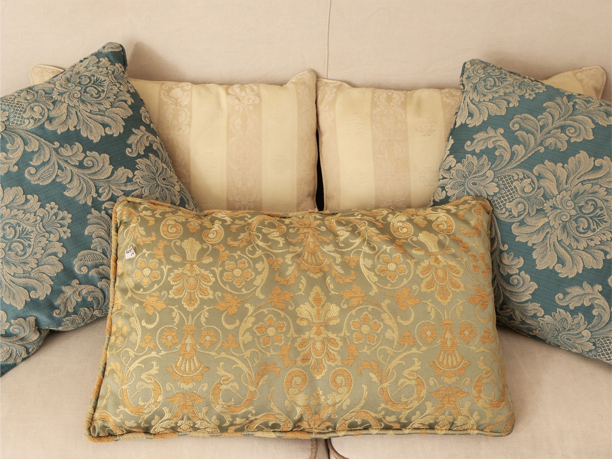 Cinque cuscini rivestiti in tessuti fantasia
