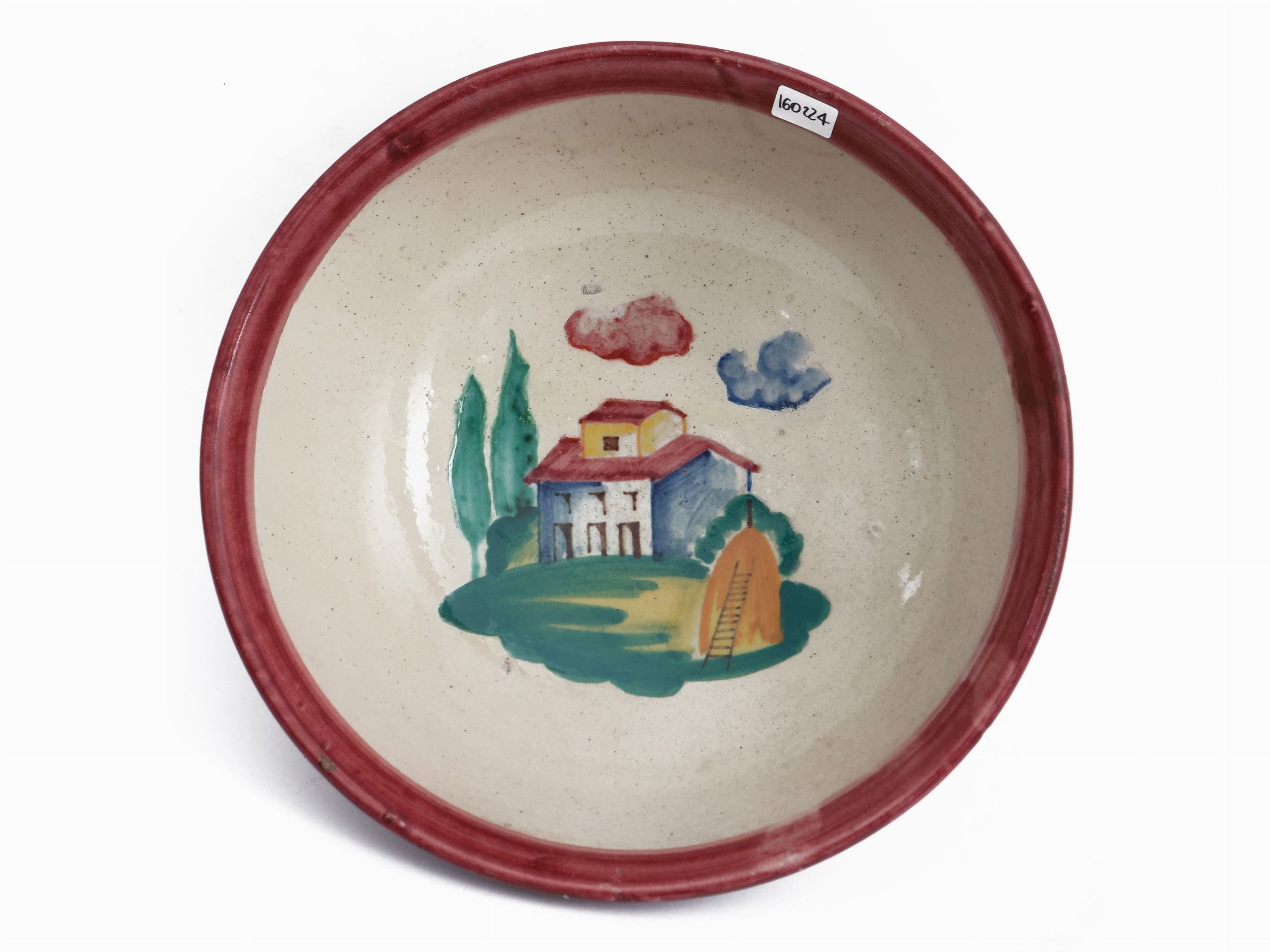 prima metà del XX secolo dipinta con paesaggio di campagna e bordo rosso, alcuni restauri