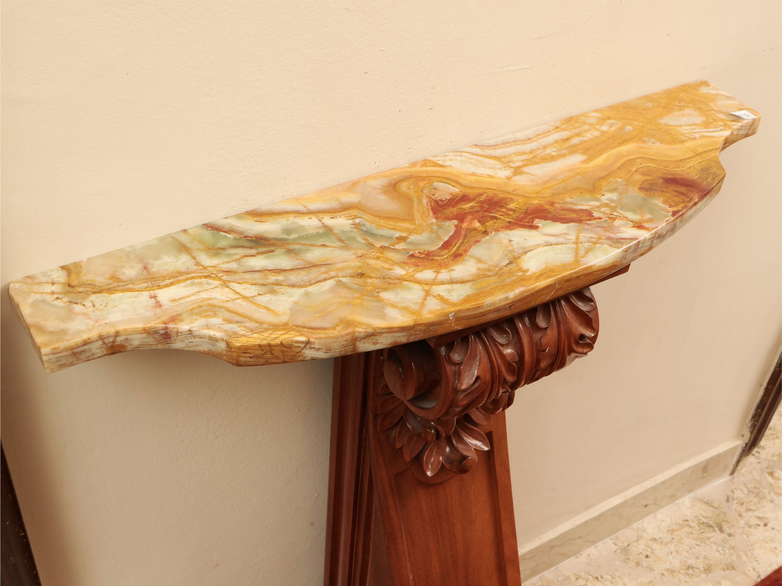 Anni Cinquanta - Sessanta piano sagomato in onice, sostegno centrale in noce, realizzato a voluta e intagliato con motivo di foglie di acanto, piede in onice