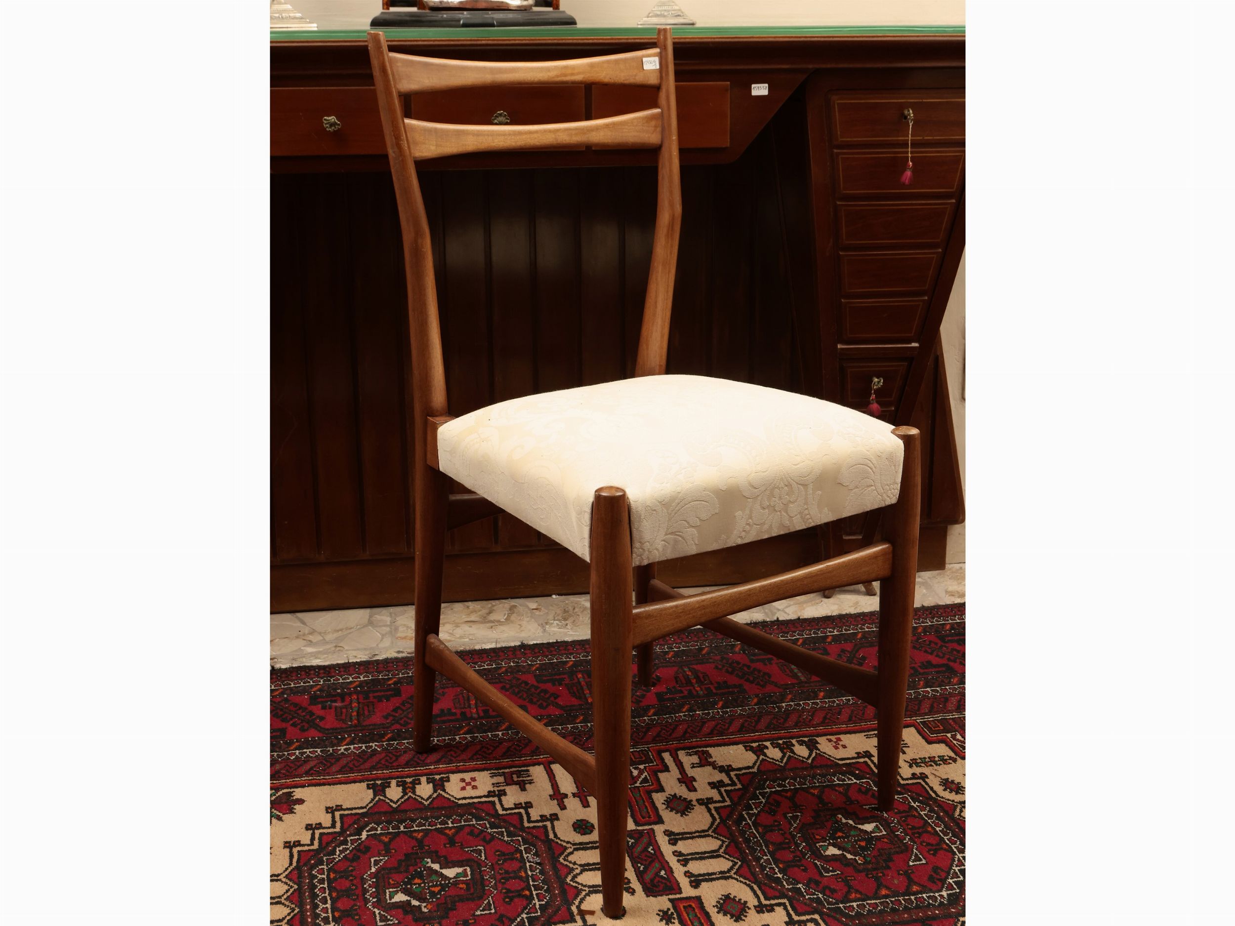 Anni Cinquanta - Sessanta schienale con cartella traforata, sedile imbottito in damasco avorio, gambe a spillo, lievi difetti