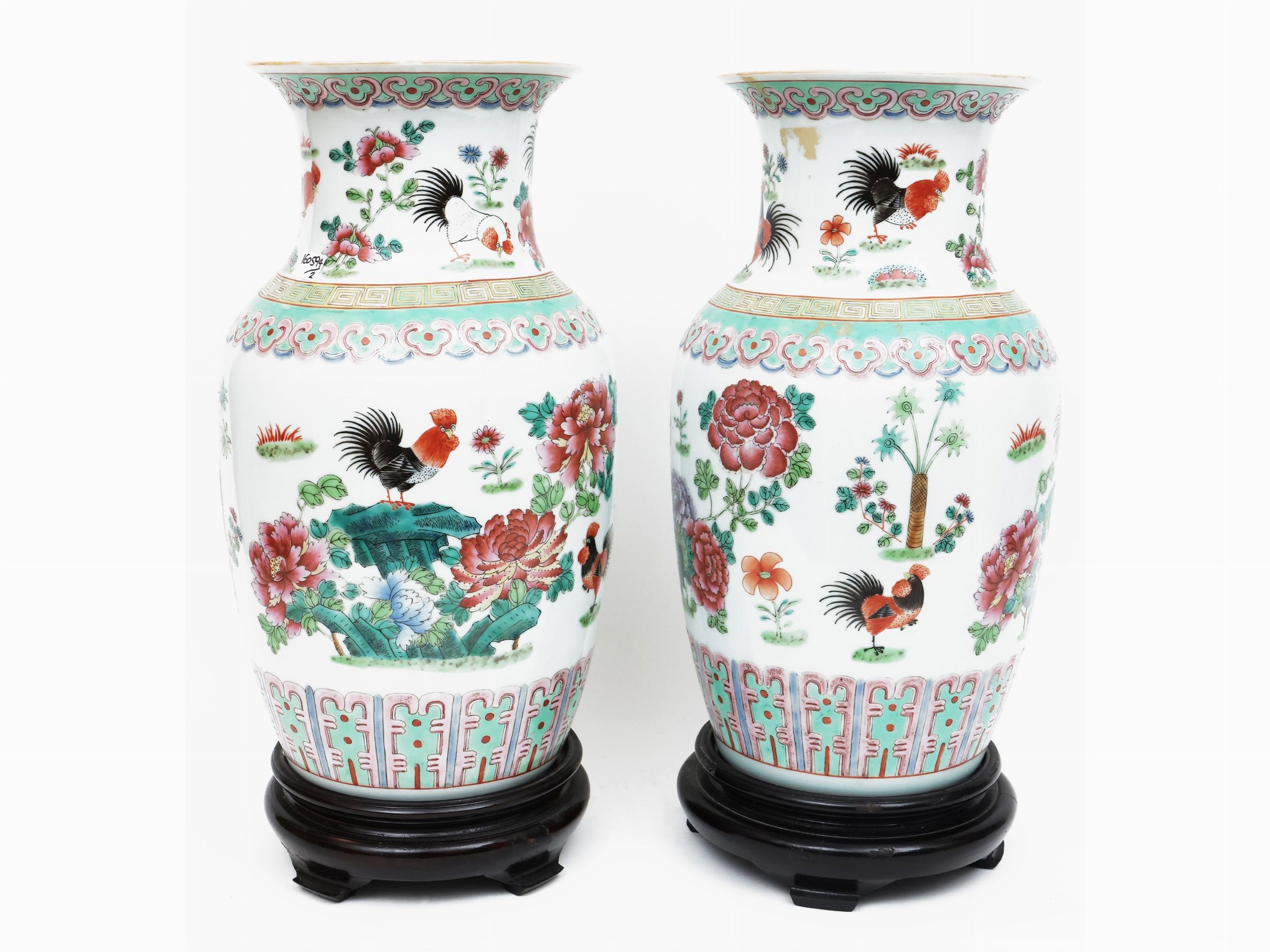 Cina, XX secolo dipinti con figure di galli, alberi e fiori, corredati di base in teak