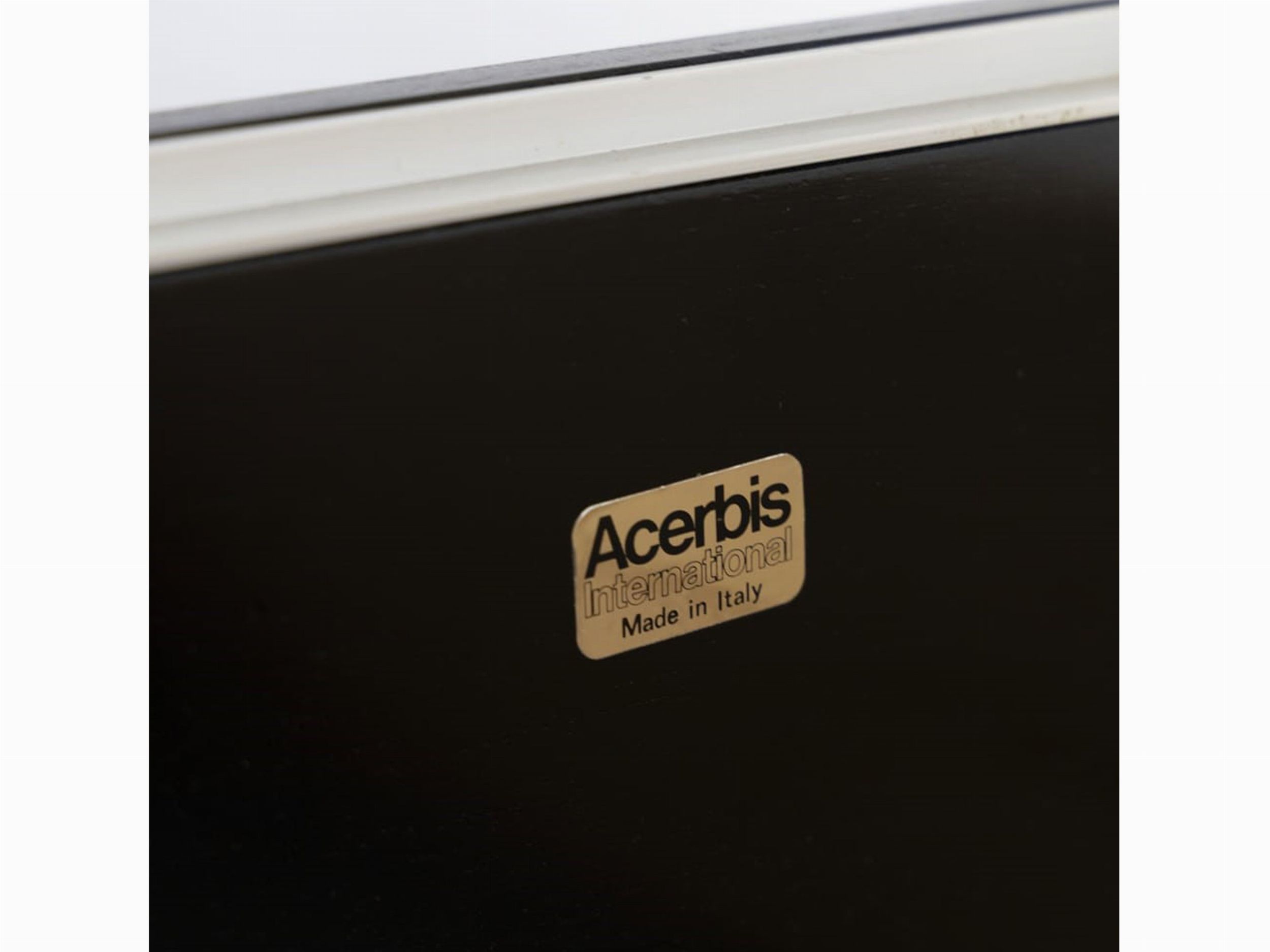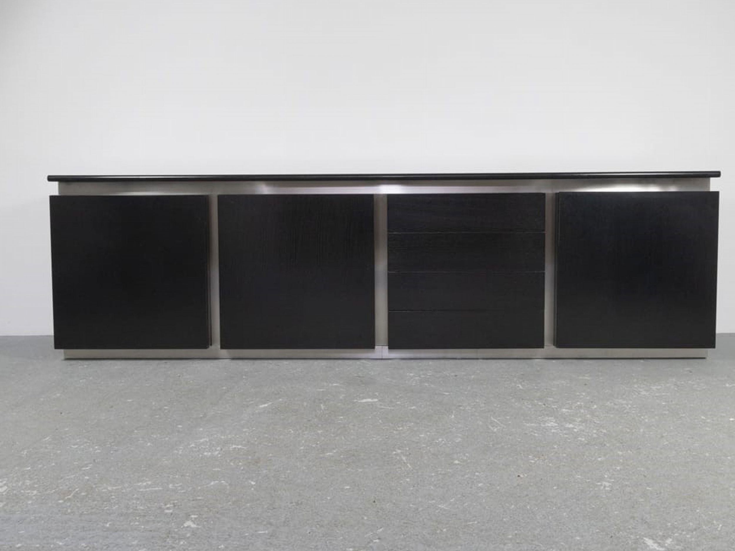 Italia, anni '70 in frassino laccato nero, sul fronte presenta tre ante a battente e un modulo centrale con quattro cassetti, finiture in alluminio. All'interno etichetta originale. Normali segni di usura.