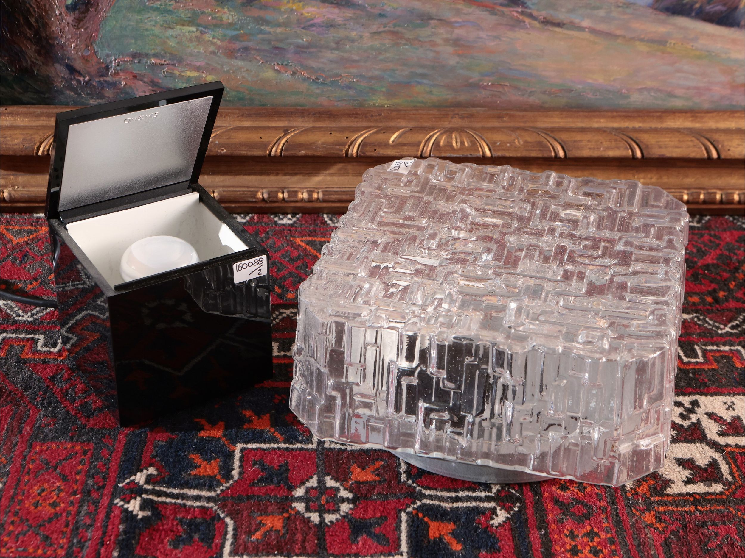 Anni Settanta/Ottanta un piccolo faretto Cuboluce, Franco Bettonica & Mario Melocchi per OPI Milano, realizzato in policarbonato nero ed una plafoniera in vetro