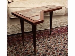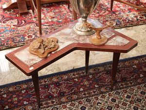 h cm 43,5x65x45 Anni Cinquanta - Sessanta piano sagomato con marmo rosso incassato, gambe a spillo con piedini [..]
