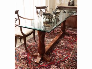 h cm 76x210x59 piano rettangolare in cristallo molato, due sostegni a clessidra riuniti da traversa, lievi dif [..]