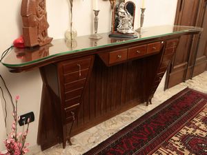 h cm 125x330x38 Anni Cinquanta - Sessanta piano sagomato con vetro incassato e alzata con mensola in vetro, cinque [..]