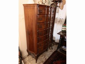 h cm 150x80x45 Anni Cinquanta - Sessanta sette cassetti sul fronte mosso, base con pendaglina intagliata con [..]