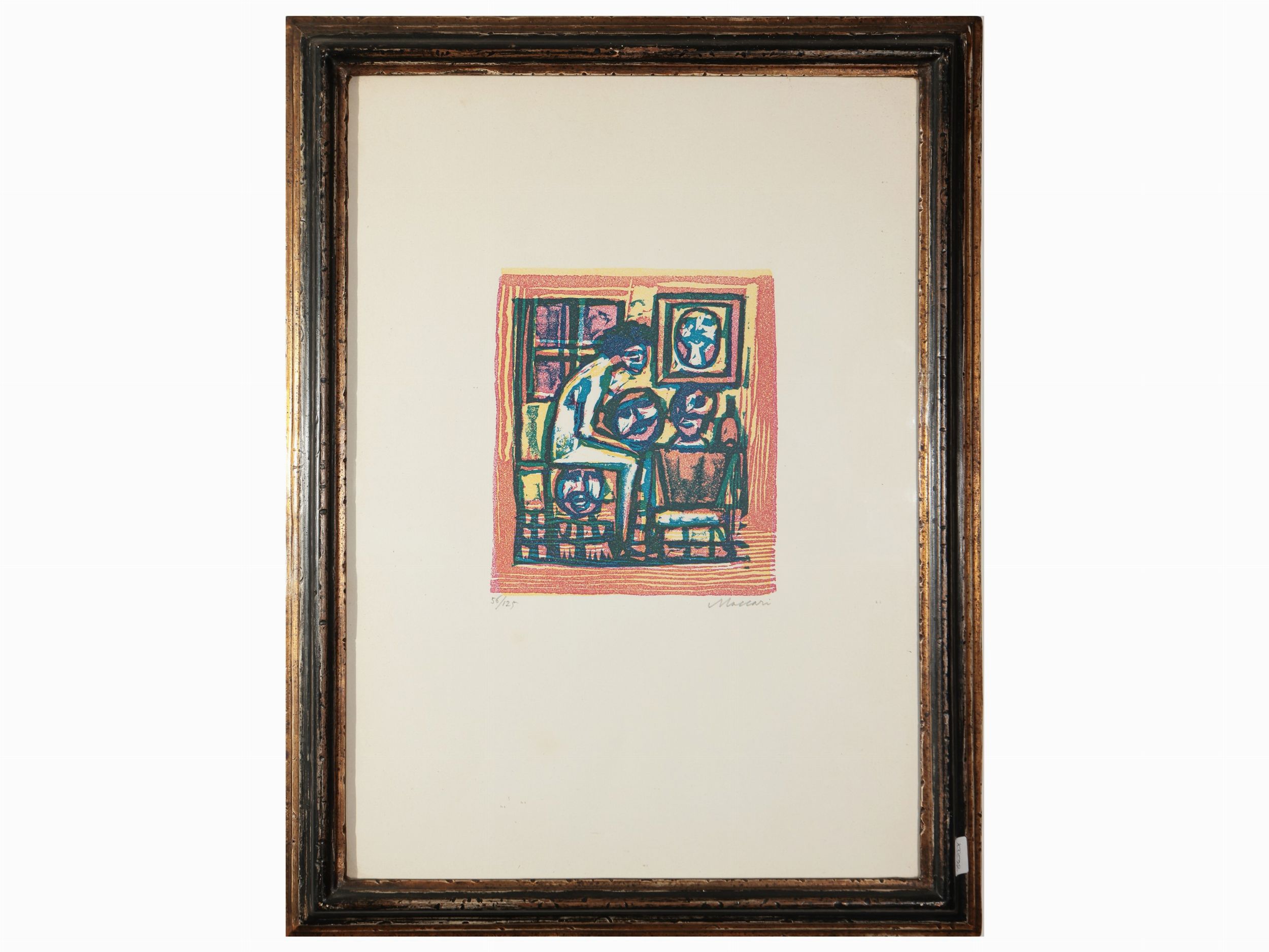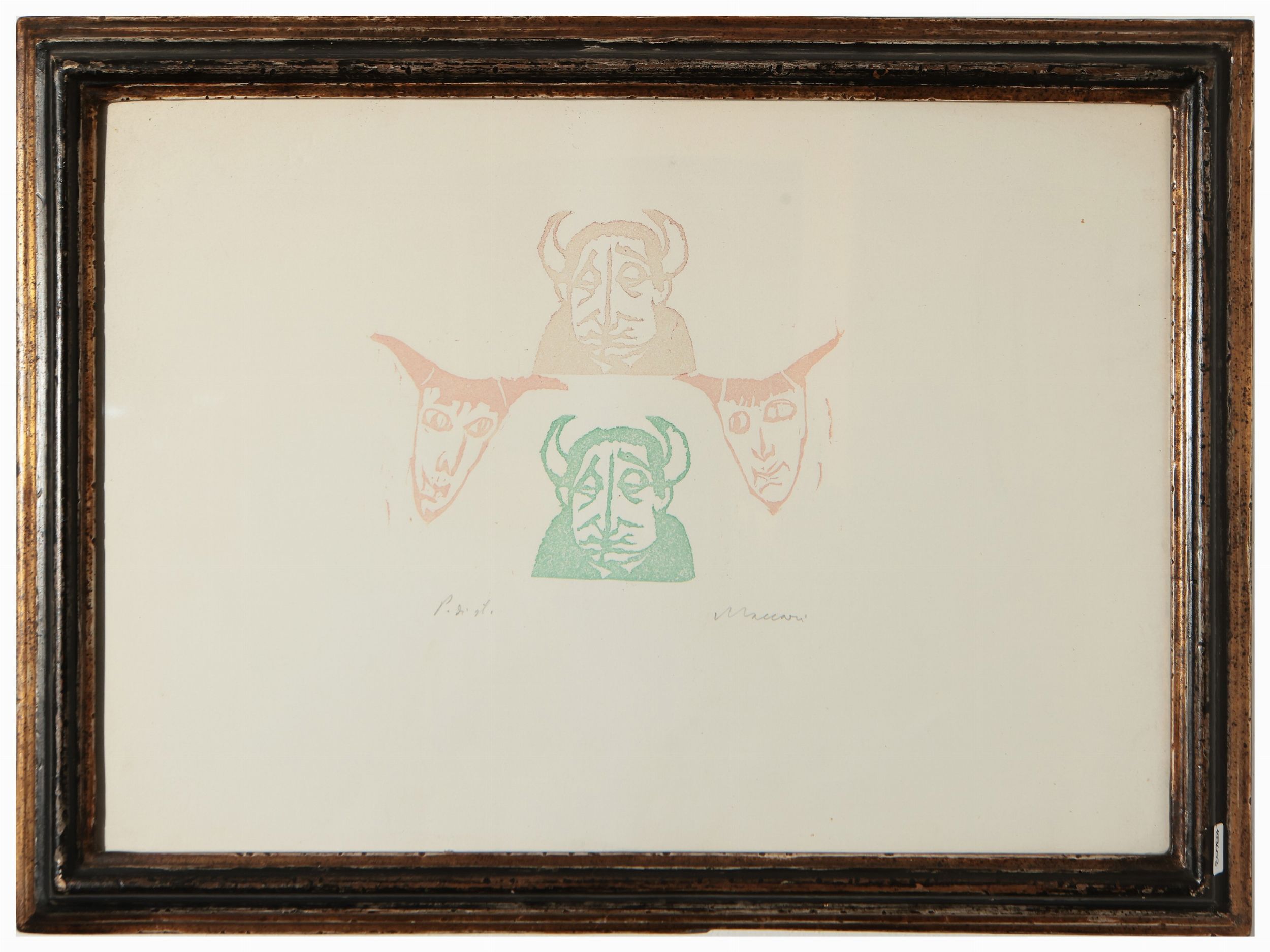 Personaggi, es 56/125, firmata, in cornice, foglio cm 48,5x33,5; Volti e maschere,es 56/125, firmata, in cornice, foglio cm 48x33,5; Maschere e diavoletti, es p.d.a, firmata, in cornice,alcuni difetti, foglio cm 34x48; Personaggi,es 16/61, firmata, in cornice, foglio cm 44x60
