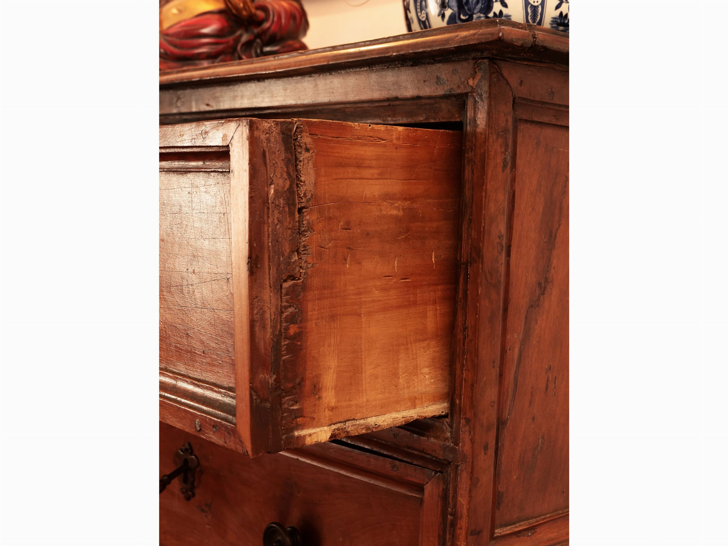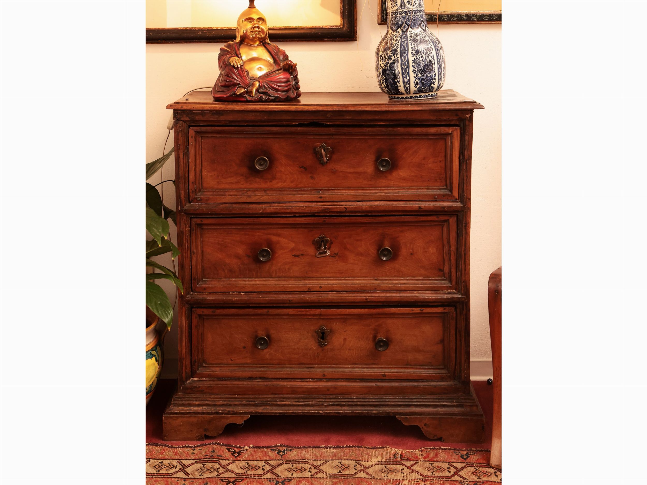 XVII secolo tre cassetti con cornice modanata sul fronte, che si ripetono sui fianchi, piedi a mensola, alcuni difetti