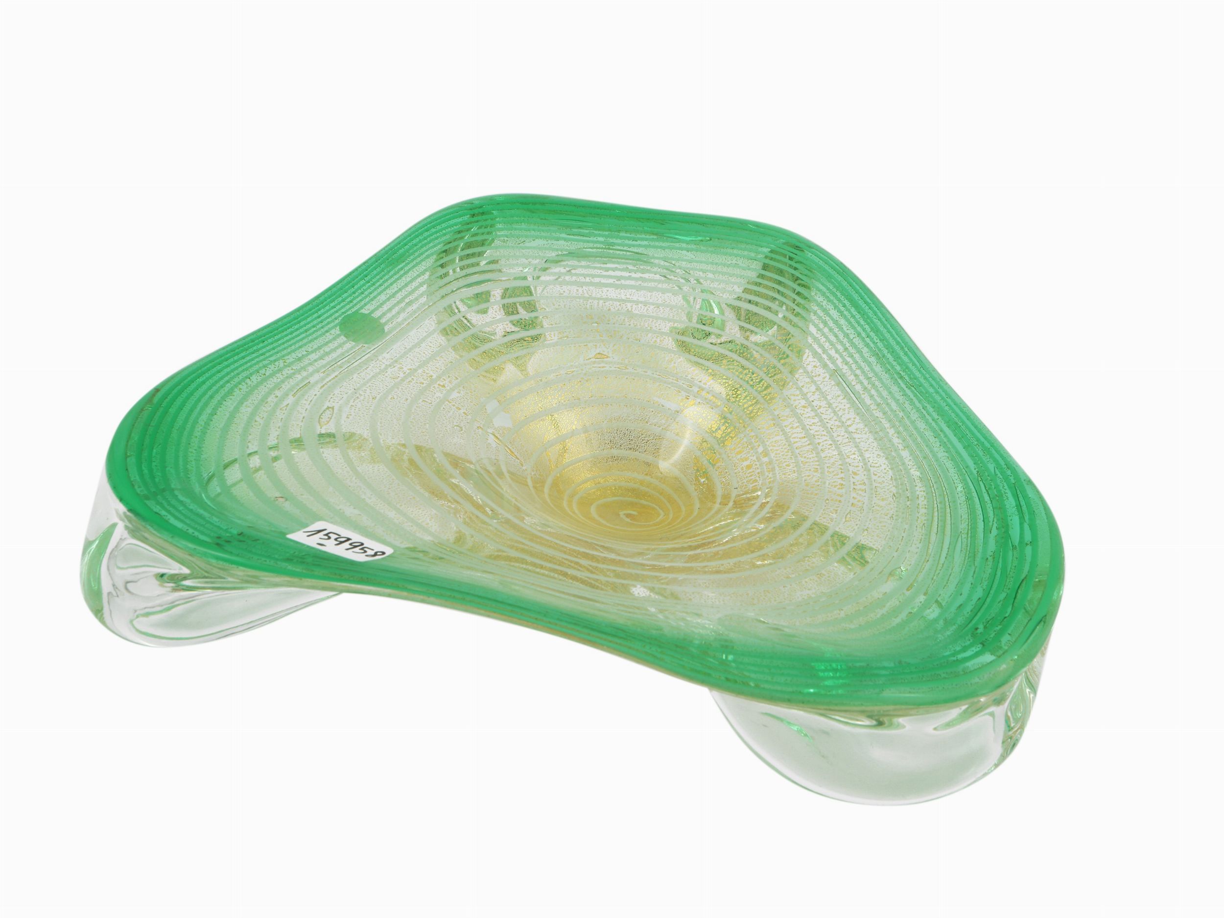 Murano, Italia di forma trilobata sui toni del verde e applicazione di foglia d'oro sul fondo.
