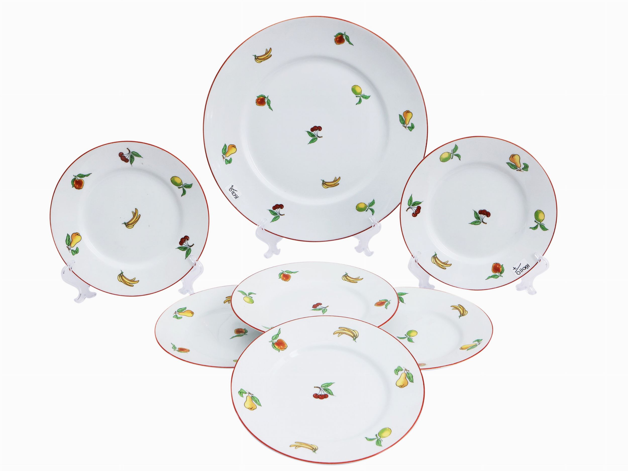 Anni Ottanta decorato con motivo di frutta, bordo profilato nei toni del rosso, composto da 6 piattini ed un vassoio rotondo a servire
