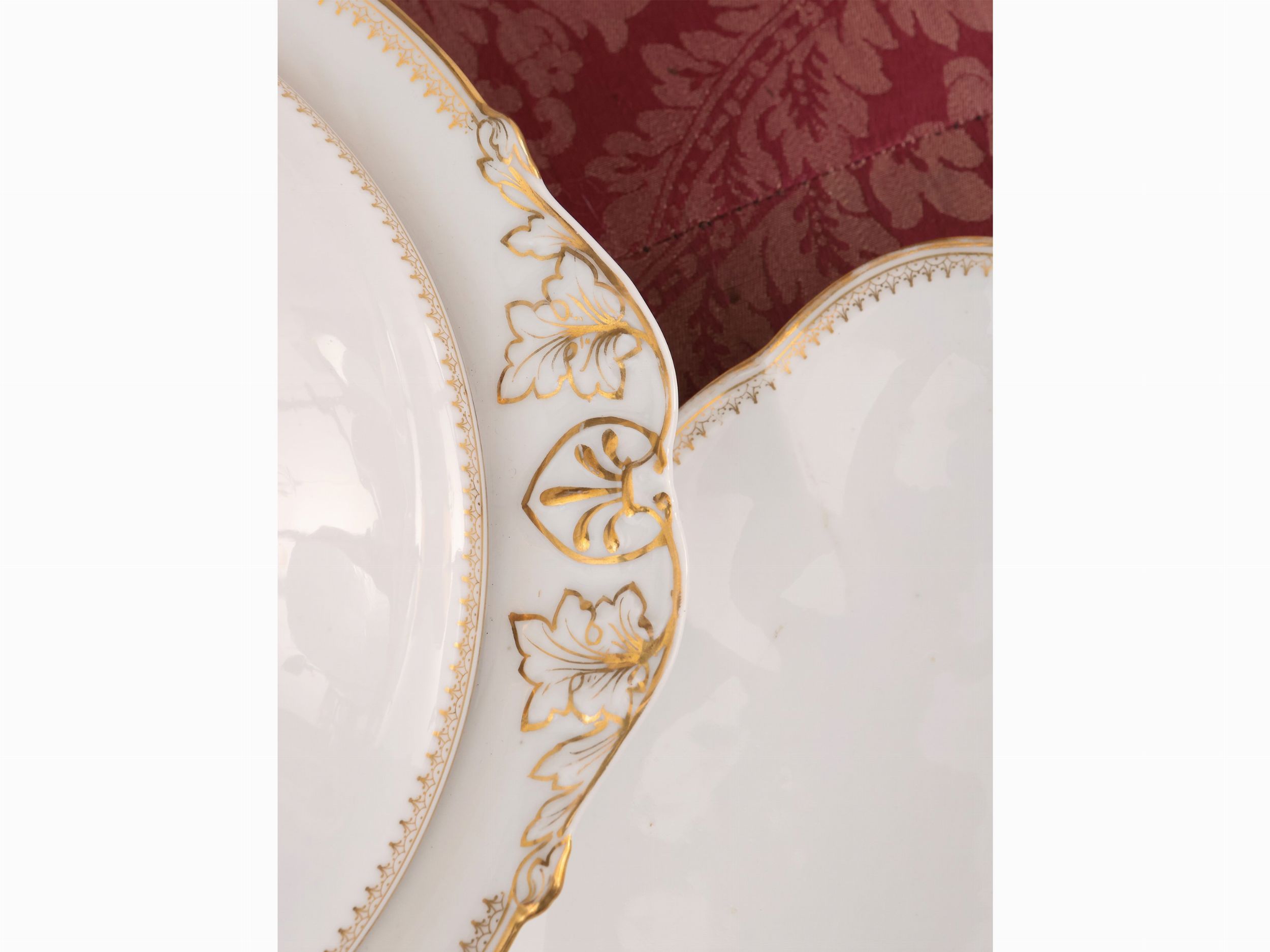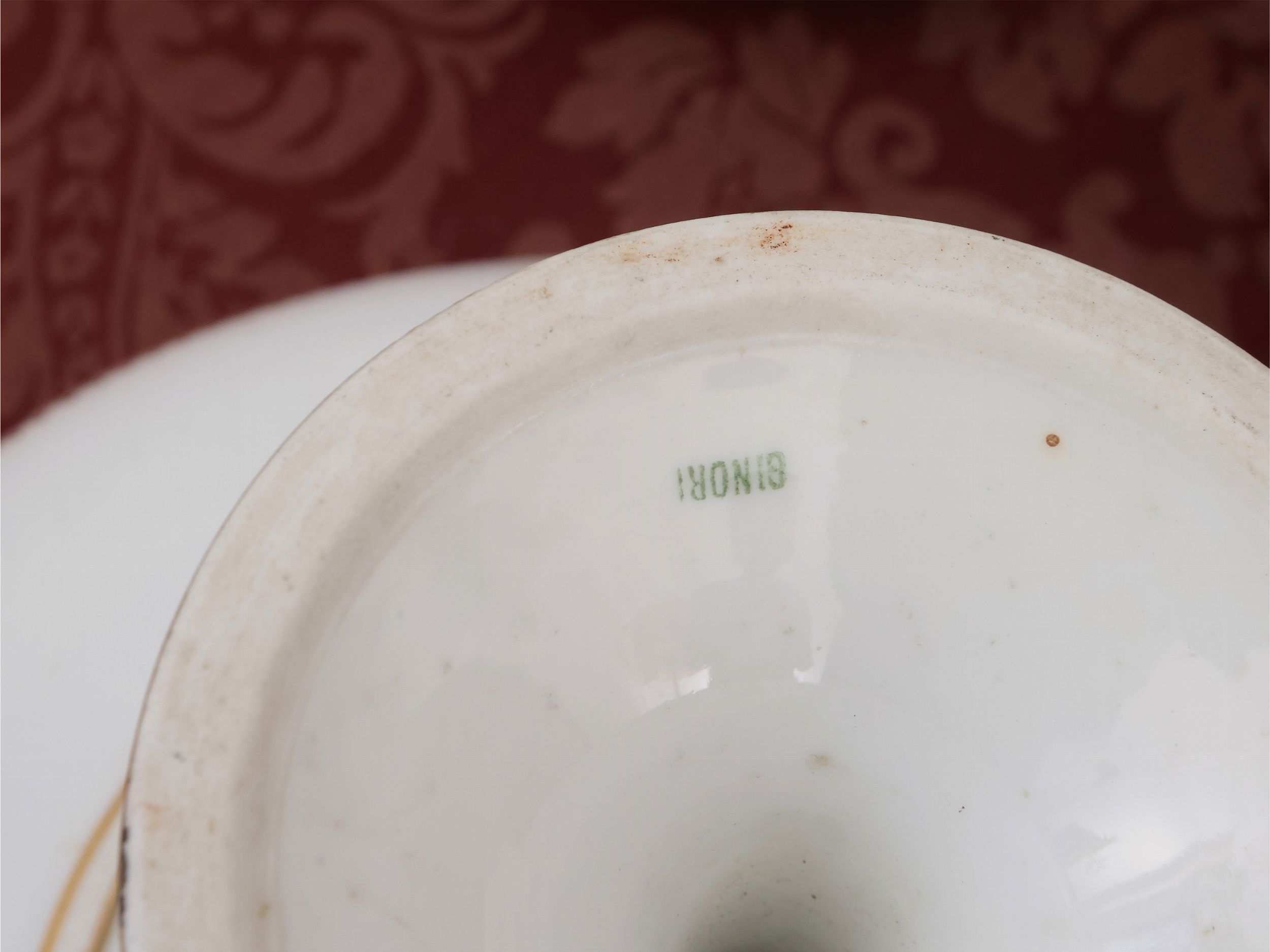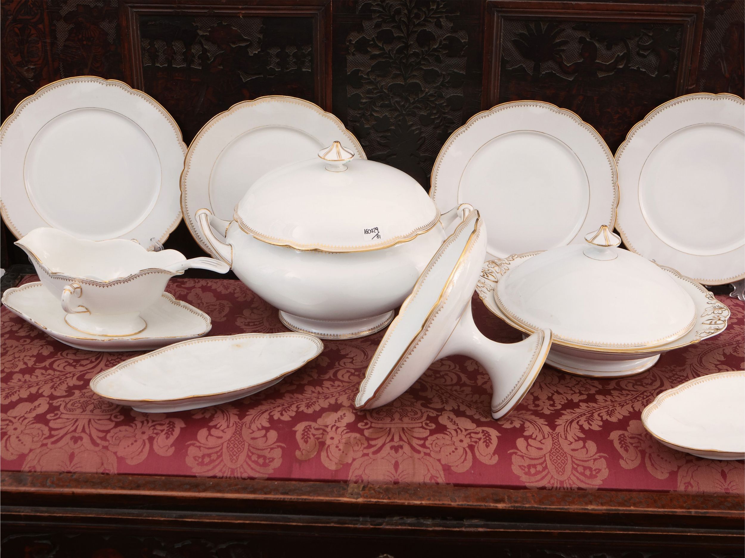 fine del XIX/inizio del XX secolo bordo mosso decorato con motivo a grata lumeggiato in oro, composto da 15 piatti fondi, 35 piatti piani, 23 piattini da antipasto, una zuppiera, una insalatiera, una legumiera, una alzatina, due salsiere complete di cucchiaio e due raviere, lievi difetti