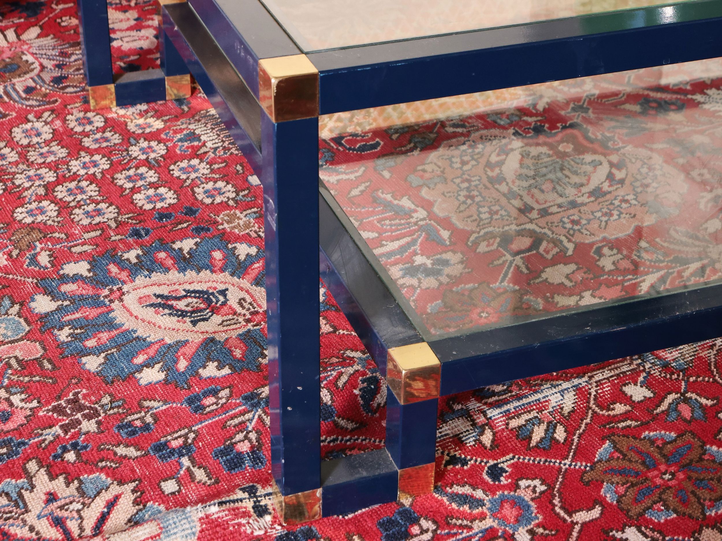 Anni Settanta struttura in acciaio laccato blu con dettagli in ottone, piano in vetro, lievi difetti