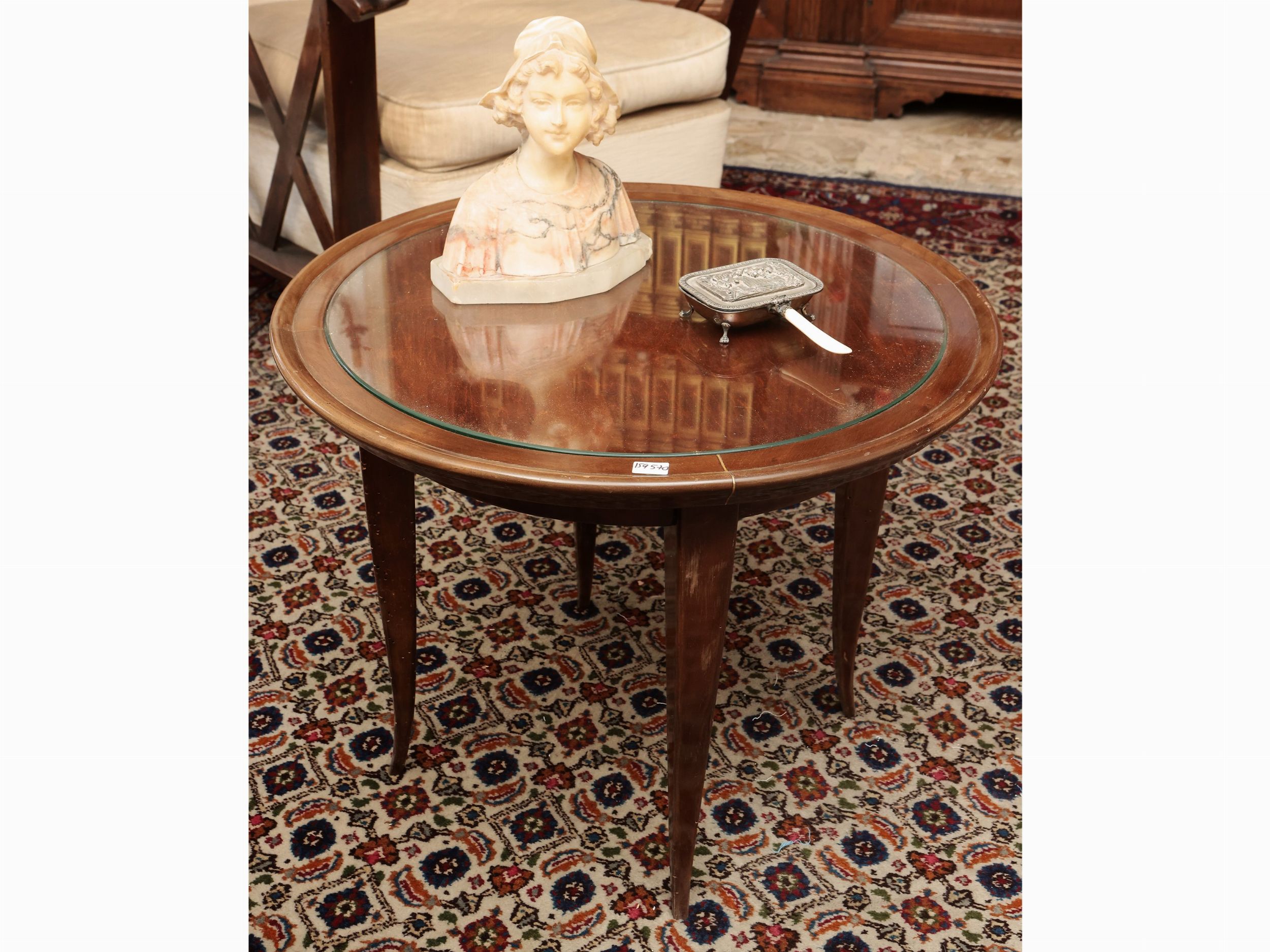 Anni Cinquanta - Sessanta piano rotondo con vetro incassato, dettagli in ottone, gambe a sciabola, lievi difetti