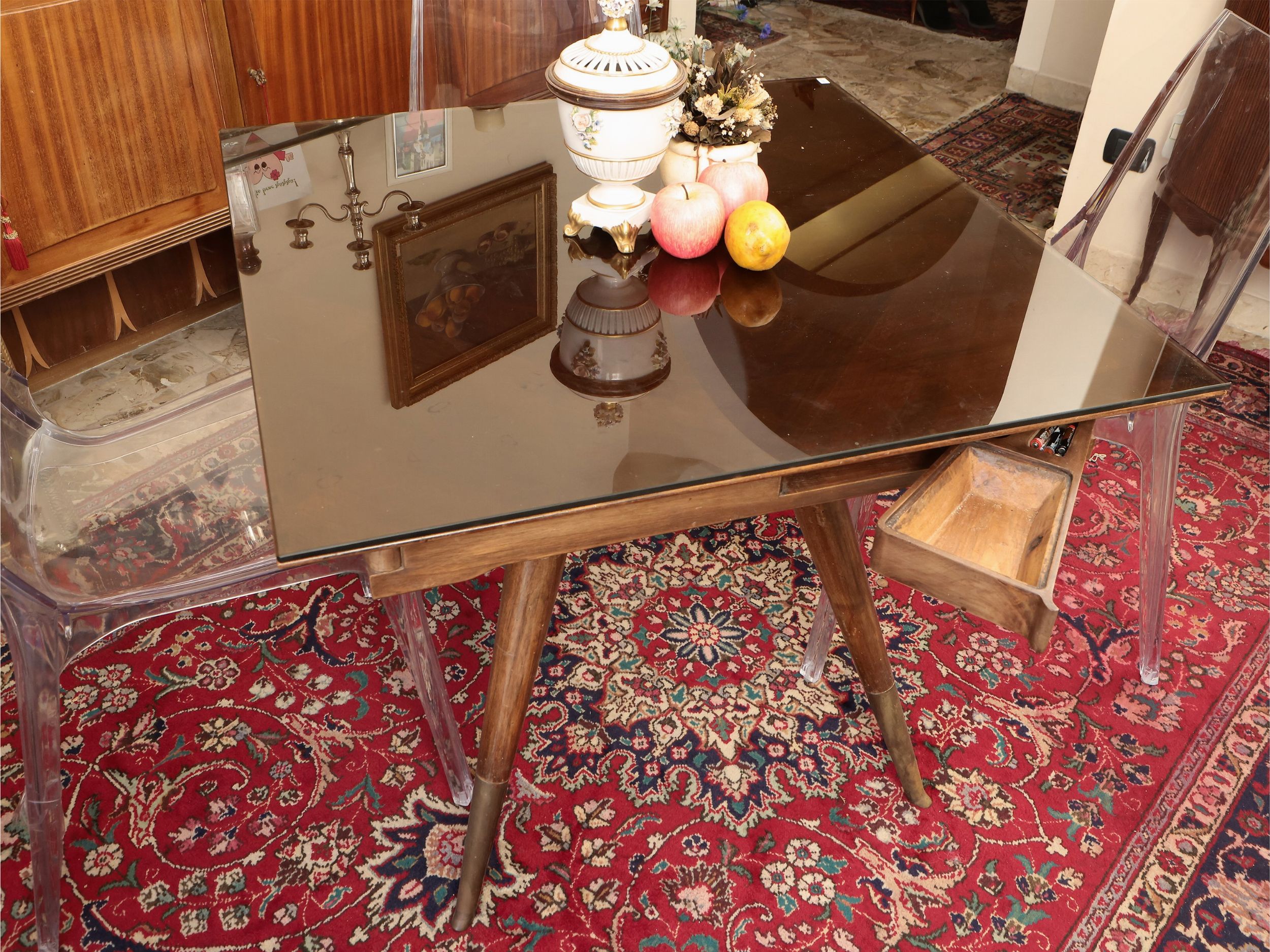 Anni Cinquanta - Sessanta piano quadrato in vetro fumé, quattro cassettini porta fiches nella fascia, su tripode con gambe a spillo e piedi con dettagli in ottone, lievi difetti