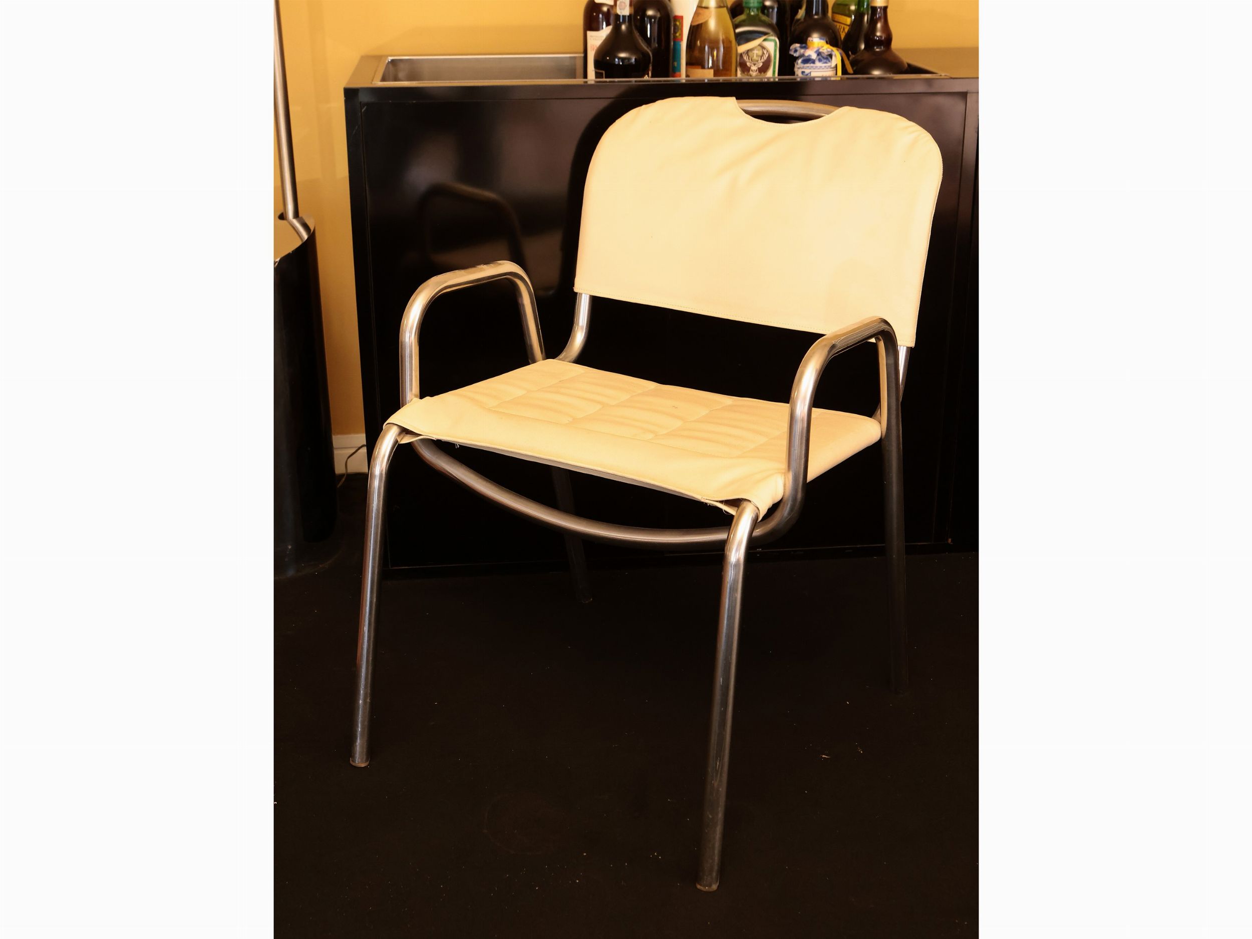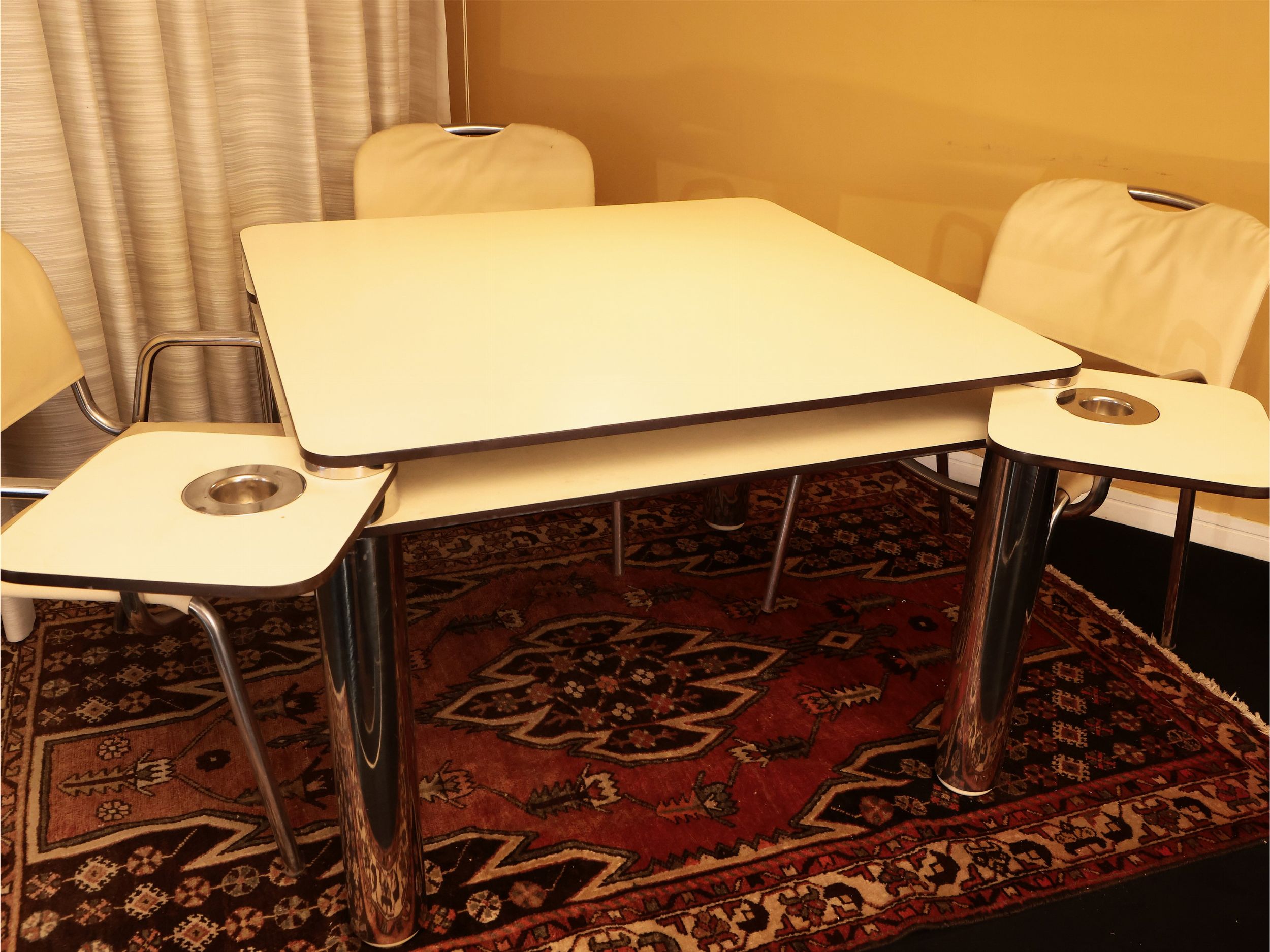 Anni Sessanta doppio piano in melanina bianca, gambe in acciaio cromato, corredato da quattro sedie in acciaio cromato