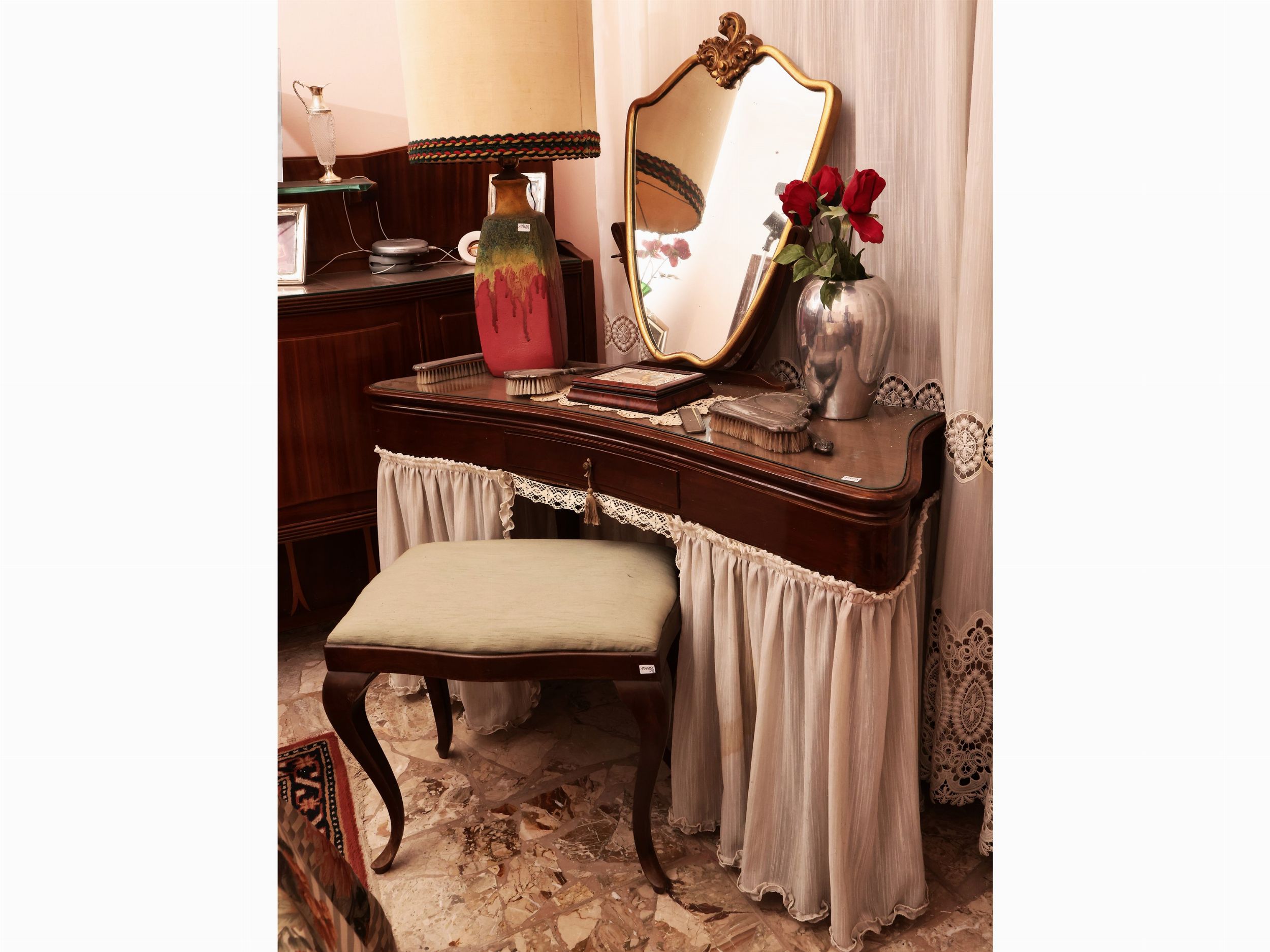 toilette h cm 135x112,5x40, sgabello h cm 45x54,5x38 (2) Anni Cinquanta - Sessanta con specchiera in legno dorato con cimasa intagliata con volute vegetali, piano sagomato con cristallo incassato, un cassetto nella fascia, corredato da sgabello imbottito e rivestito in seta verde salvia