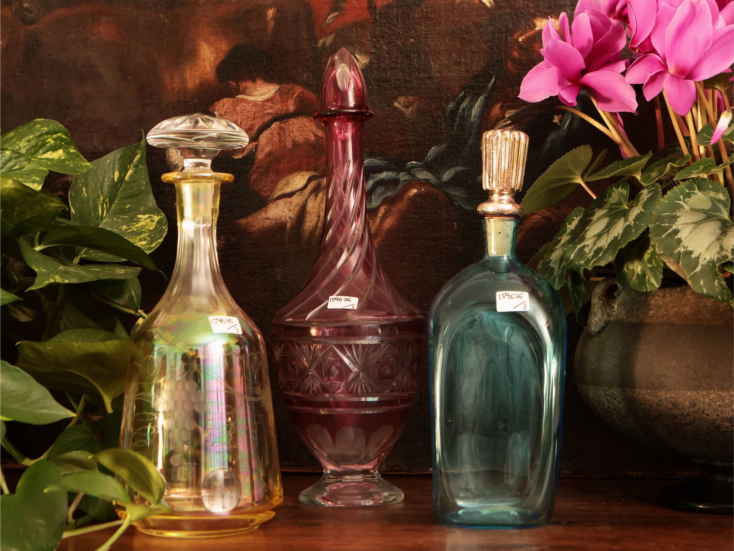 Tre bottiglie da liquore in vetro e cristallo da collezione