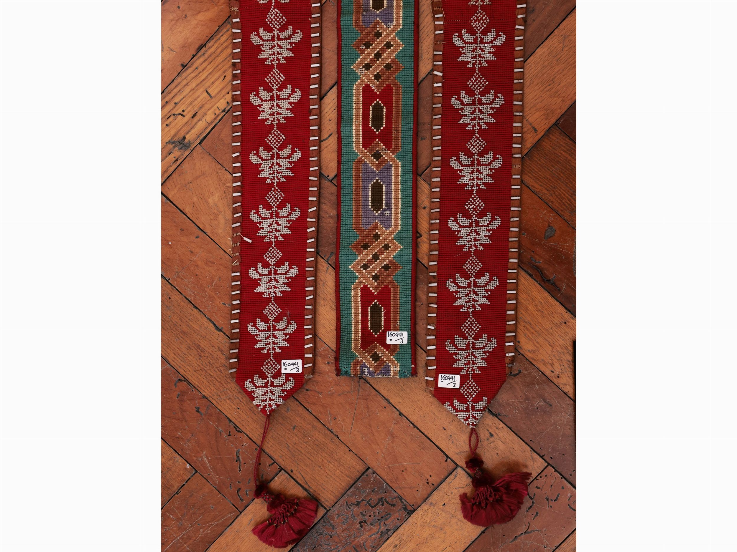 lungh cm 212 e cm 264 (3) fine del XIX secolo due ricamati con perline a formare motivo floreale stilizzato su fondo rosso e finali con nappe, l'altro ricamato a piccolo punto nei toni del rosso, blu e beige su fondo verde, retro in seta, alcuni difetti e restauri alla fodera
