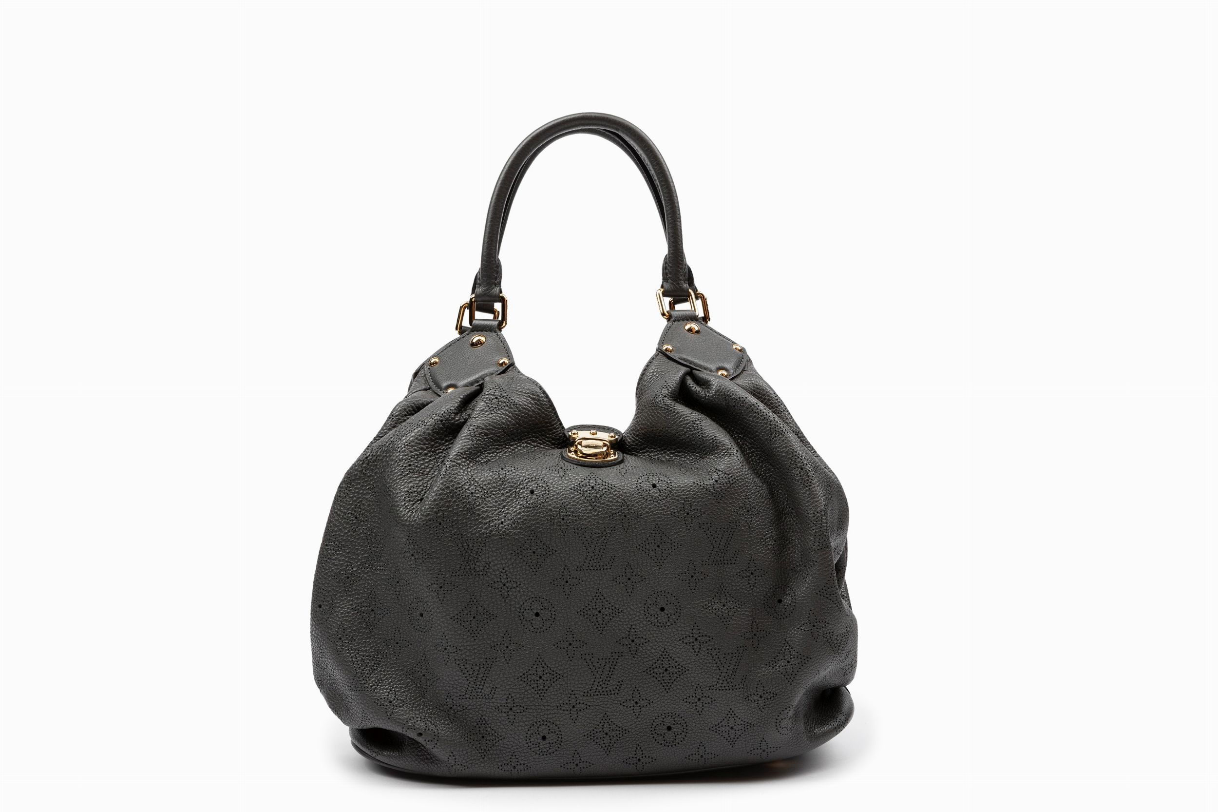 in pelle monogram tahina color grigio con doppi manici, dettagli in metallo dorato, cm 35, con sacchetto