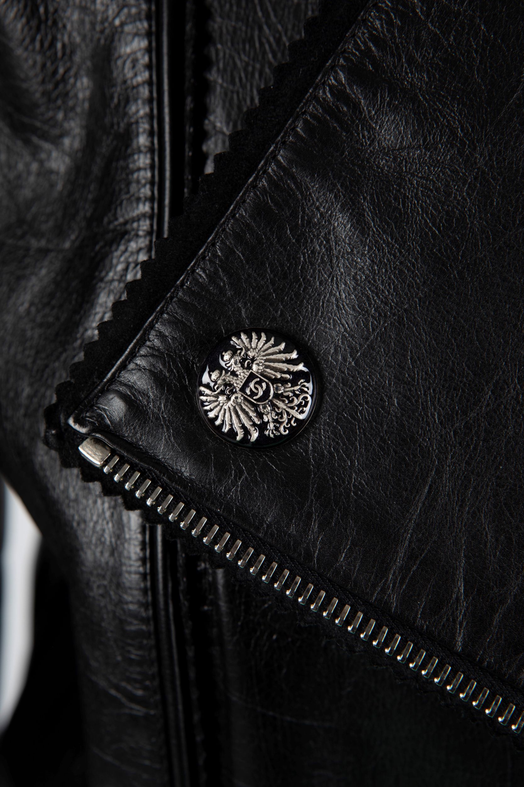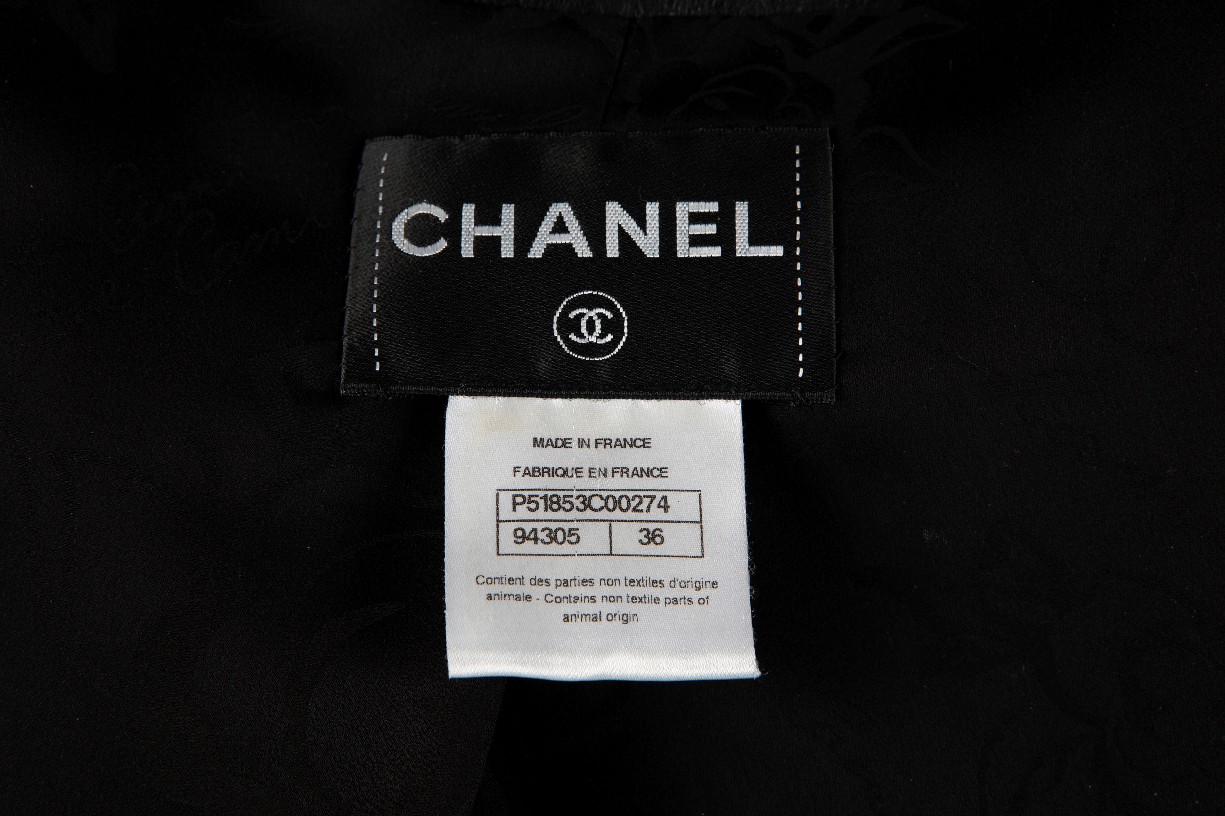 a manica lunga in pelle color nero, chiusura con cerniera, fodera in seta, taglia 36 francese, con custodia