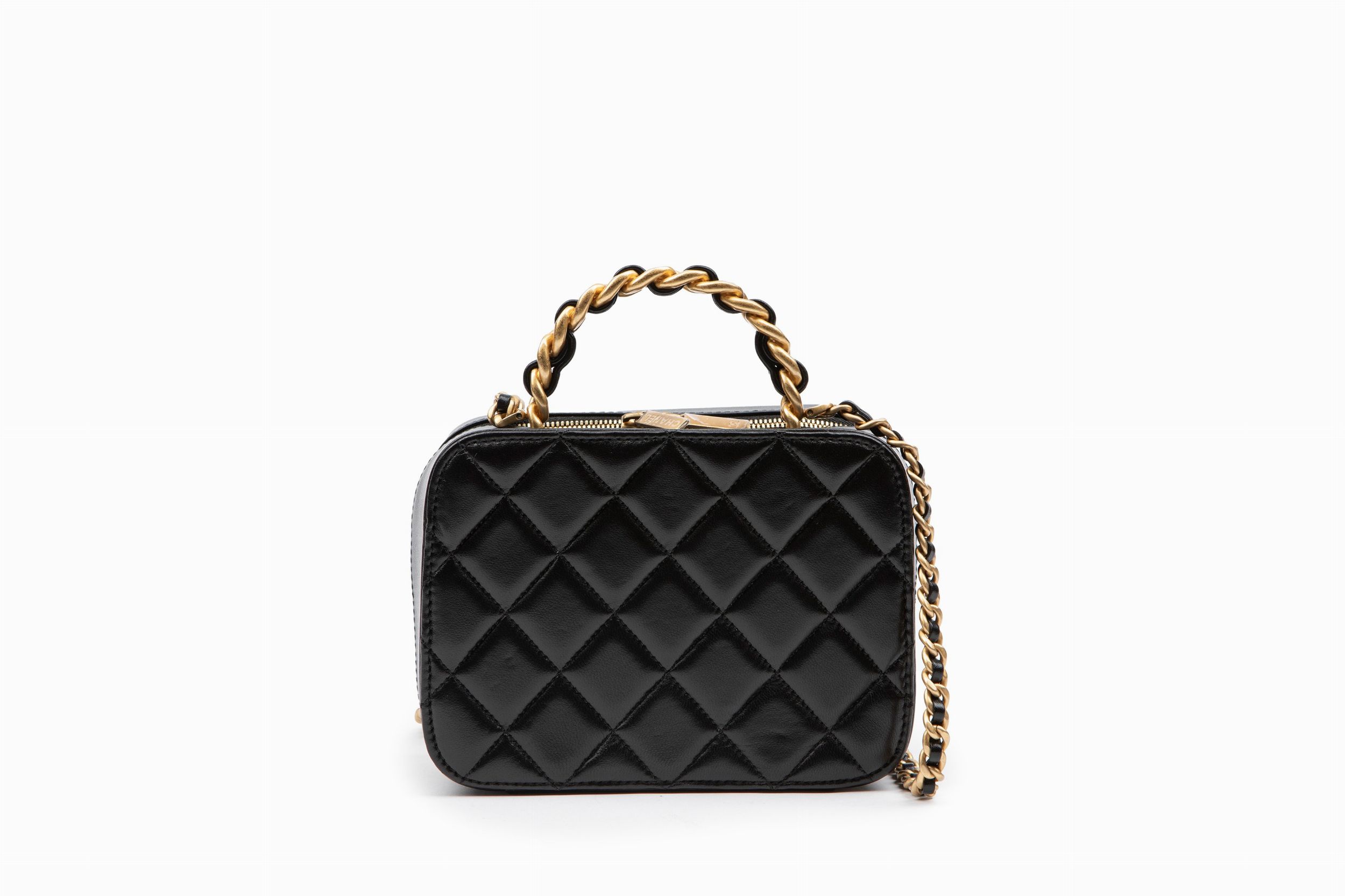 in pelle trapuntata color nero, manico rigido e tracolla in metallo dorato satinato, cm 17 x 13 x 6,5, con sacchetto (lievissimi difetti)