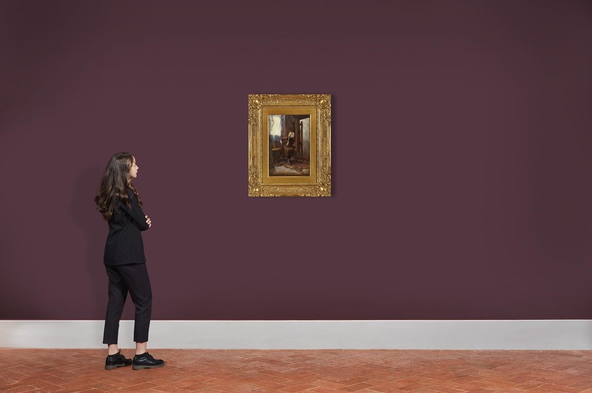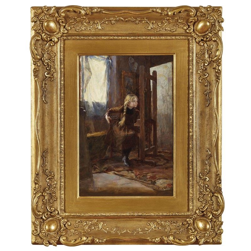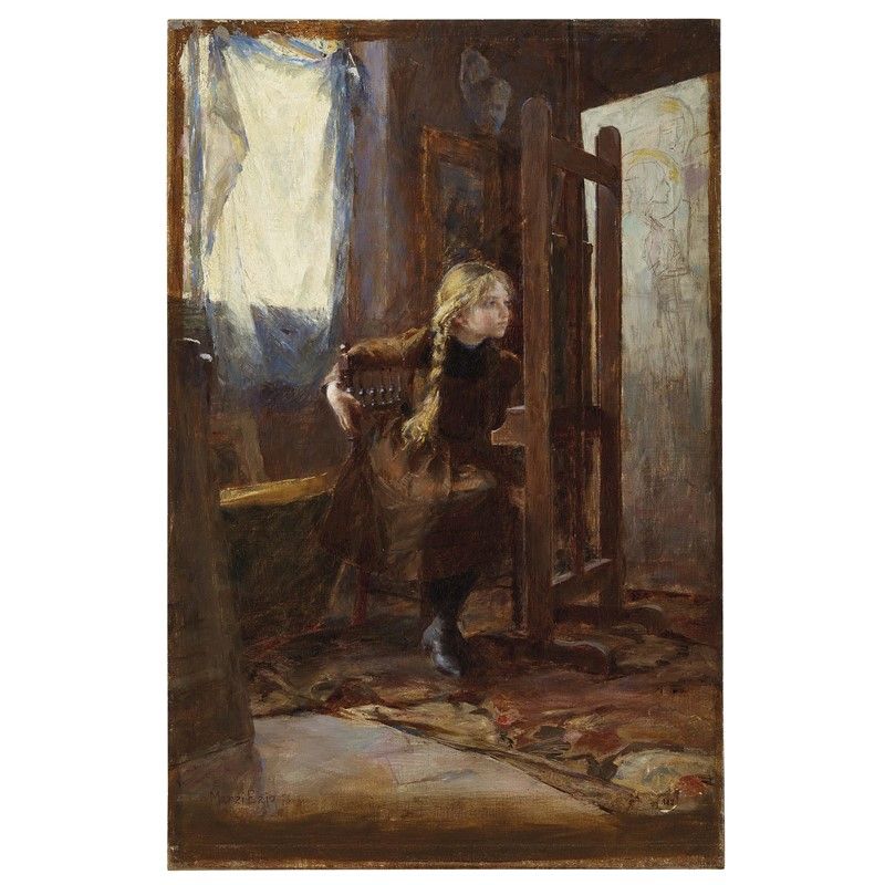 Di Marzi, purtroppo, si conosce troppo poco per qualificare questa opera all’interno della sua produzione. Dopo gli studi con Ciaranfi all’Accademia fiorentina, il pittore dovette eseguire copie, restauri e illustrazioni per sbarcare il lunario. In seguito, troppo amante del bel disegno per essere convinto dallo sperimentalismo del primo Novecento, se dedicò in buona parte a dipinti sacri e ritratti; inoltre collaborò come disegnatore in un atelier di tessitura a Firenze (A.P Torresi, a cura di, Il “Dizionario Faini”. Repertorio biografico di pittori, scultori, grafici, architetti e restauratori toscani del primo Novecento, Ferrara, 1997, p.93). Sorprende, quindi, per un artista apparentemente così defilato, il numero di presenze alle mostre nazionali, dall’esordio a Bologna nel 1896 fino all’ultima partecipazione registrata a Roma nel 1927 (R.Breda, 1890-1940 Artisti e mostre. Repertorio di pittori e incisori italiani in esposizioni nazionali, Roma, 2001, p.310). Tra le mostre, quella di Livorno del 1901, alla quale Marzi presentò quest’opera (secondo la cortese segnalazione di Giulia Marzi), riveste particolare importanza, in quanto vi parteciparono anche Oscar Ghiglia, Ulvi Liegi, Llewelyn Lloyd, Mario Puccini e Plinio Nomellini, tutt’altro che seguaci della tradizione accademica. Marzi non era incline al rinnovamento, ma non era privo d’invenzione. Il gioco di luce, con l’accenno di forme e oggetti particolari di un atelier, rende l’interpretazione del soggetto quasi una visione, in cui lo sguardo fisso della bambina appare più interrogativo che ammirato. In un’altra rappresentazione dell’atelier, Autoritratto nello studio (collezione privata), del 1905, l’artista ripropone una composizione simile, rappresentandosi in un colloquio metafisico con una figura settecentesca.
