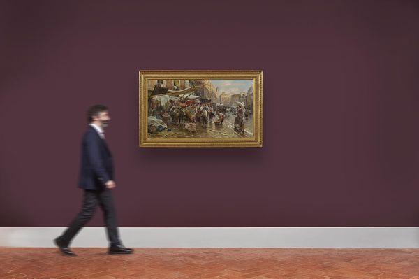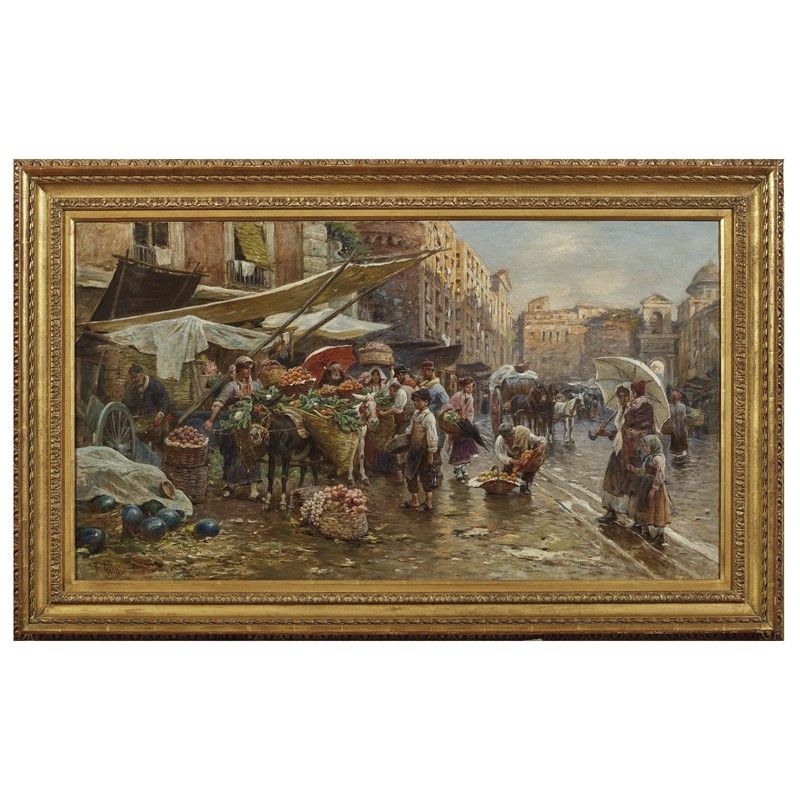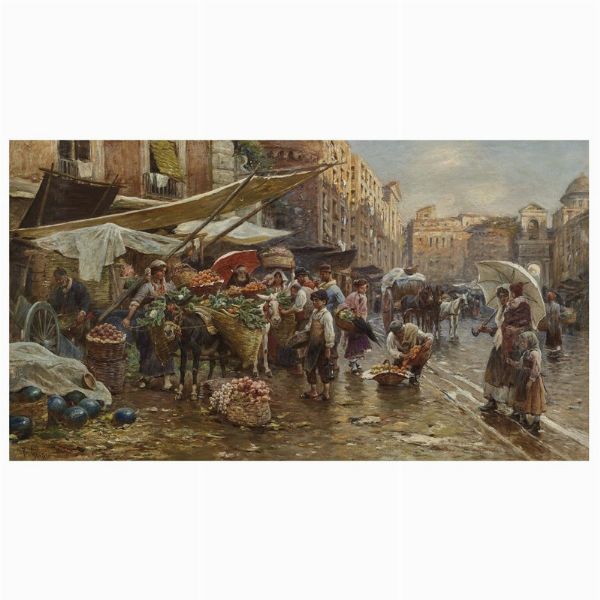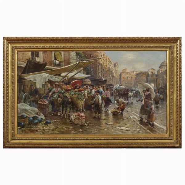MARKET IN PORTA CAPUANA, NAPLES oil on canvas, 62x112 cm signed lower left on the reverse: on the stretcher label Daniel B. Grossman, Inc./ Fine art in New York