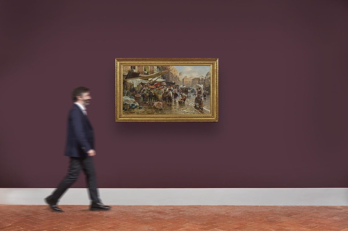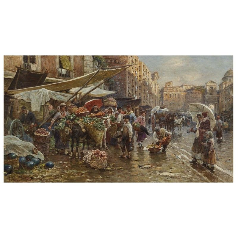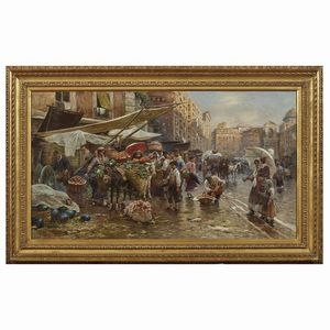 Franz Theodor Aerni (Aarburg 1853 - 1918) MERCATO A PORTA CAPUANA, NAPOLI olio su tela, cm 62x112 firmato in basso a sinistra retro: sul telaio cartiglio Daniel B. Grossman, Inc./ Fine art di New York