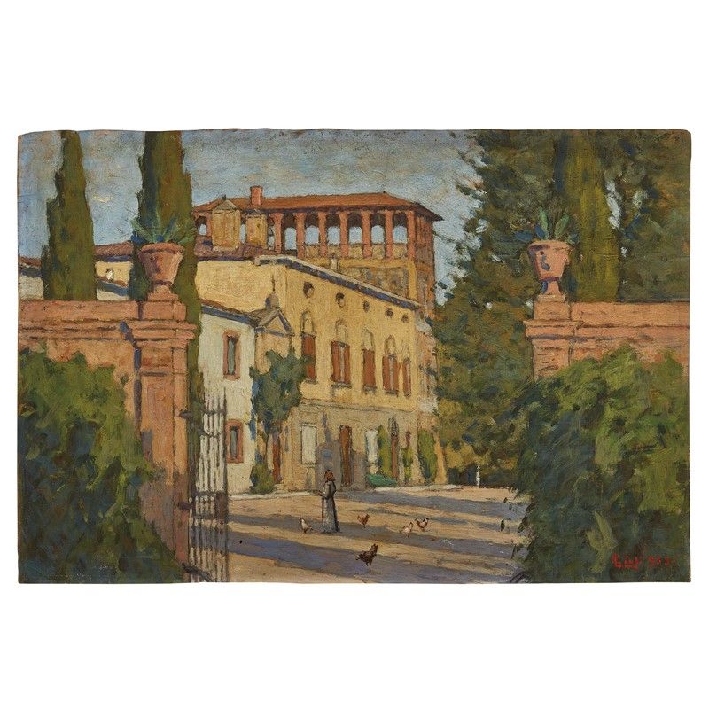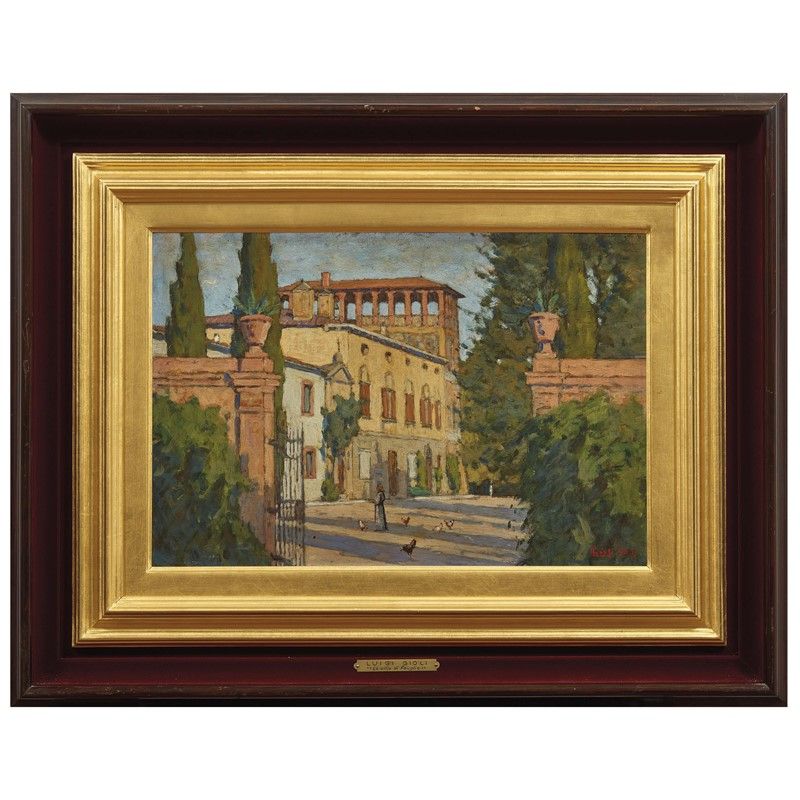 Luigi Gioli (San Frediano a Settimo 1854 - Firenze 1947) LA VILLA DEI GIOLI A FAUGLIA olio su tavoletta, cm 32x47,5 firmato e datato “935” in basso destra retro: titolato e datato “Pisa 1935”, timbro della collezione Borgiotti a firma Mario Borgiotti