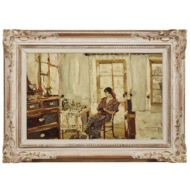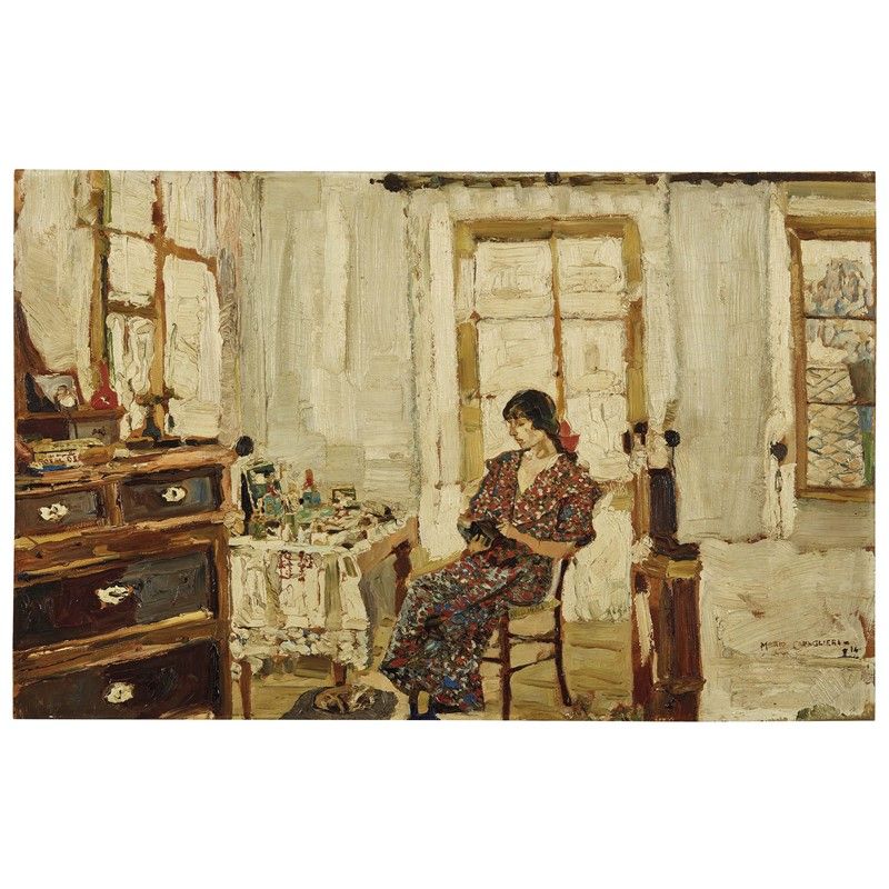 La materia pittorica di Mario Cavaglieri si afferma in tutta la sua intensità nel meraviglioso interno presentato in catalogo. Dalle tre finestre, placida ma inarrestabile, la luce diviene impasto cromatico e inonda l’ambiente dalle bianche pareti, definendone sinteticamente gli oggetti. Nella semplicità della camera di montagna il piccolo levriero dorme acciambellato su un cuscino, una scatola di sigarette è sul cassettone marrone, mentre sul tavolino da toeletta l’asciugamano rivela le cifre “CP”, Pacifico Cavaglieri, padre di Mario. Al centro della composizione si staglia Giulietta Catellini De Grossi, vezzosamente chiamata “Juliette”, musa assoluta dell’arte e della vita del pittore. Indossa un abito fantasia rosso e blu e un nastro rosso tra i capelli, il capo chino e gli occhi bassi, assorti nella lettura del volumetto che tiene tra le mani.