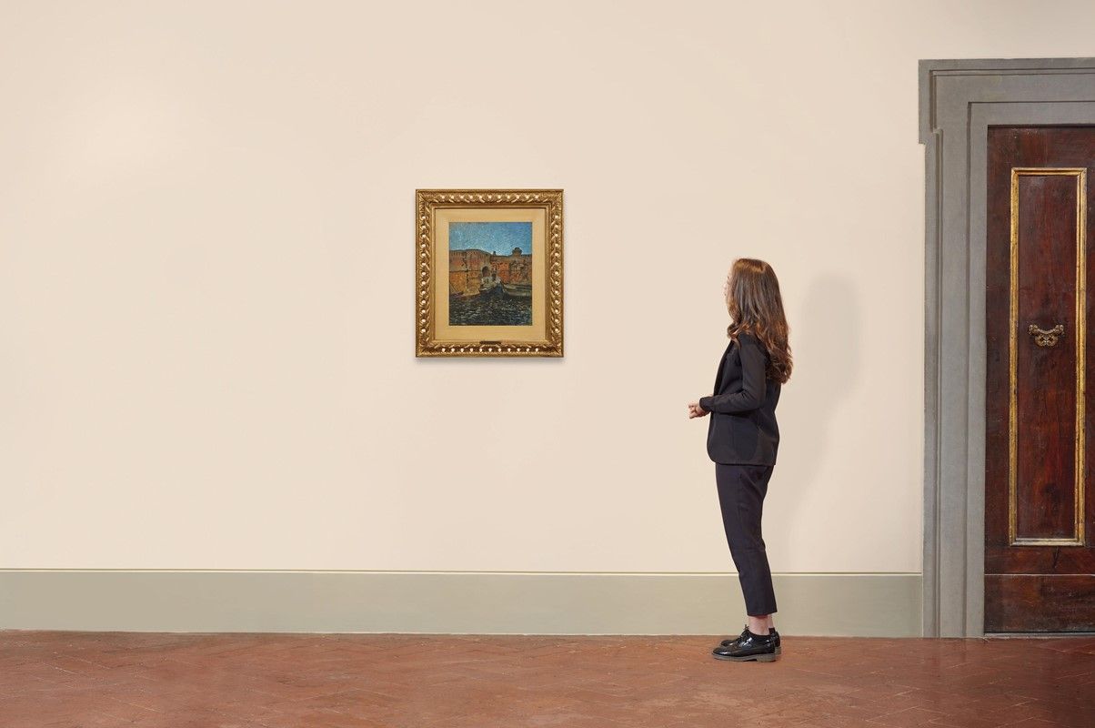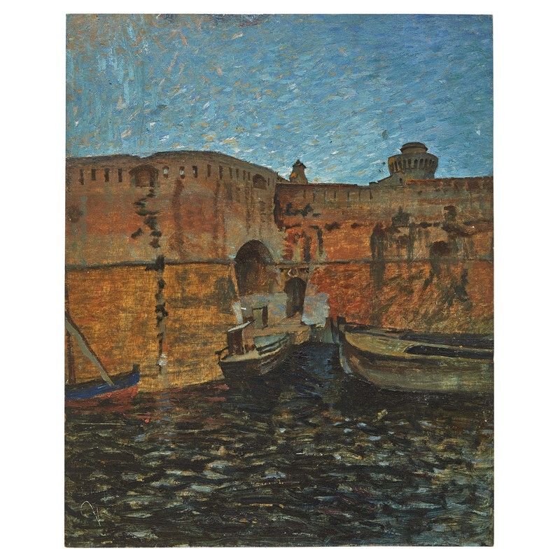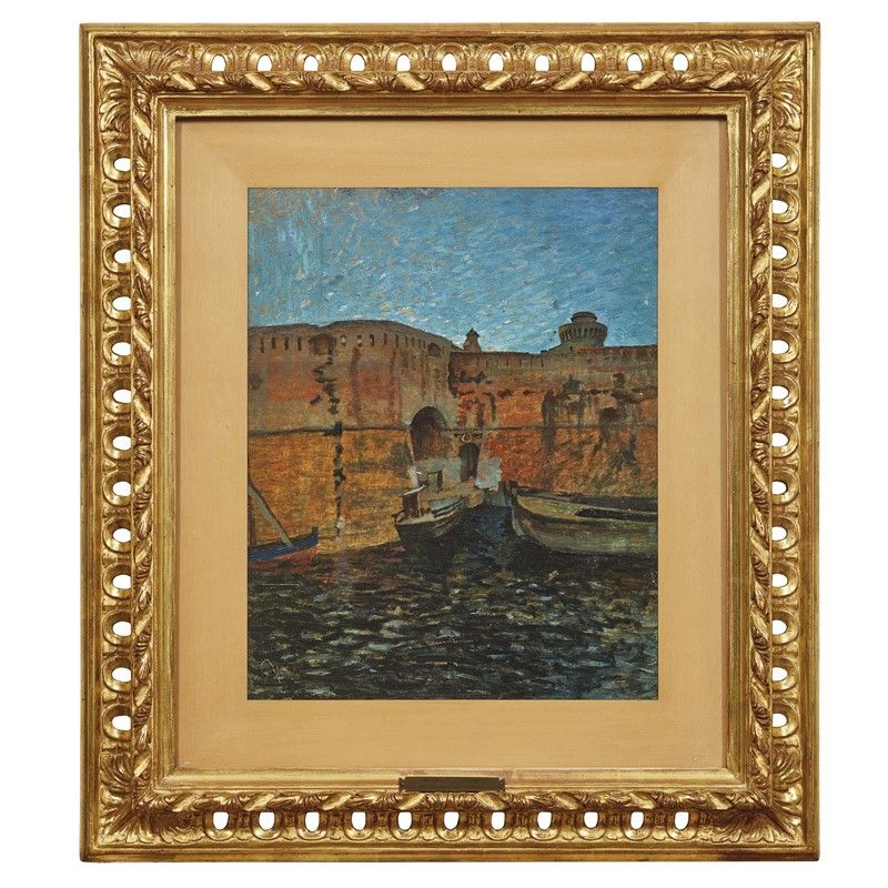 on the reverse: inscribed Questo quadro proviene dalla raccolta del Maresciallo d'Italia Enrico Caniglia lo dedico al suo pronipote Emilio Baracco nella mia qualità di erede Pietro Caniglia, label of Collezione M. Galli, double stamp of Galleria Panconi signed for authentication by Mario Panconi, stamp of Galleria La Tartaruga in Antignano