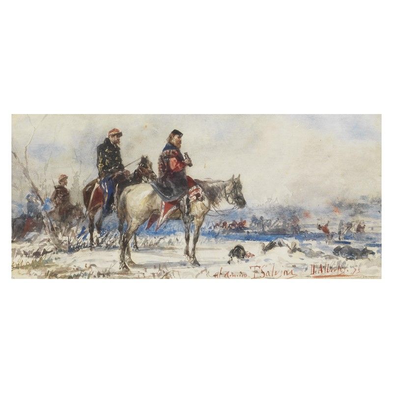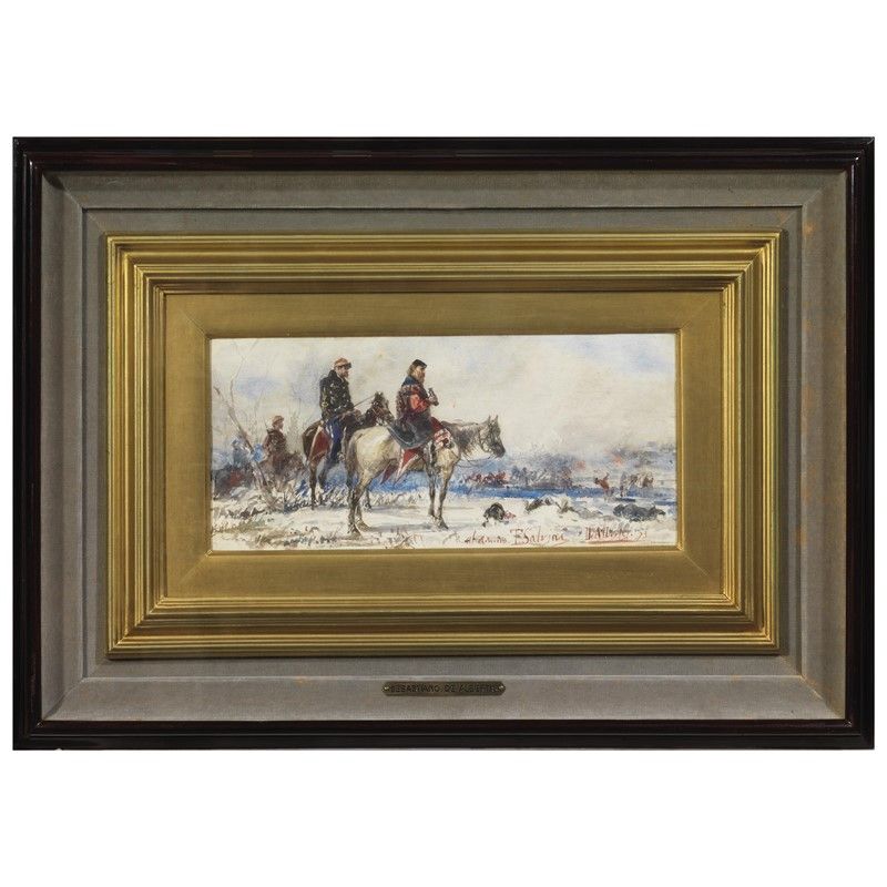 GARIBALDI ON THE BATTLEFIELD watercolor on paper, 12.5x26.5 cm signed, dedicated and dated All’amico T. Salvini '73 lower right on the reverse: declaration of authenticity by Aldo Gonnelli, on the cover cardboard label Libreria Luigi Gonnelli inscribed by Aldo Gonnelli