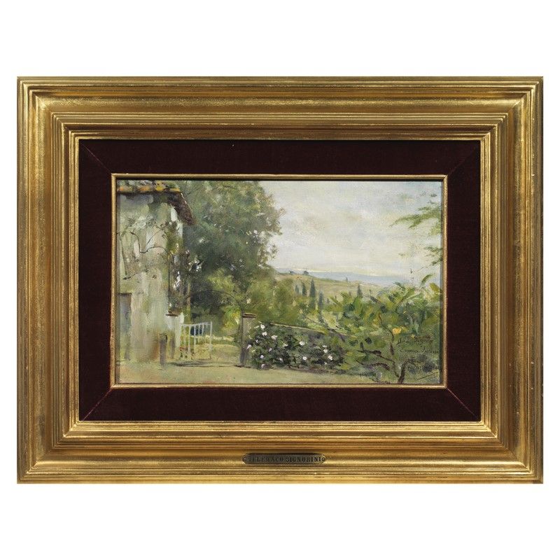 Dedicato a Emma Fucini, moglie di Renato Fucini, questo piccolo olio di Telemaco Signorini coglie il giardino di Dianella nella sua fioritura primaverile. Personaggio versatile, medico, letterato, arguto conoscitore e frequentatore dei circoli artistici fiorentini e toscani, Renato Fucini fece di Dianella, la villa di famiglia presso Empoli a Vinci, un centro d’incontri letterari e musicali frequentati dai più conosciuti pittori e musicisti del tempo. Tra questi ricordiamo, oltre a Telemaco Signorini, Niccolò Cannicci, Vittorio Matteo Corcos, Luigi Gioli, Arturo Faldi, Mario Puccini, Angiolo Tommasi e il Maestro Giacomo Puccini.