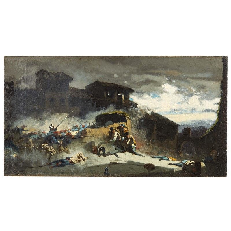 Il bozzetto qui presentato, spesso chiamato Carica di Zuavi, rappresenta lo studiop per la tela più grande della serie: La Cacciata degli austriaci. Quest’ultima fu esposta alla Promotrice di Firenze del 1861 e successivamente alla prima Esposizione Nazionale, dove ottenne una medaglia per essere poi acquistata da Isabella Falconer.