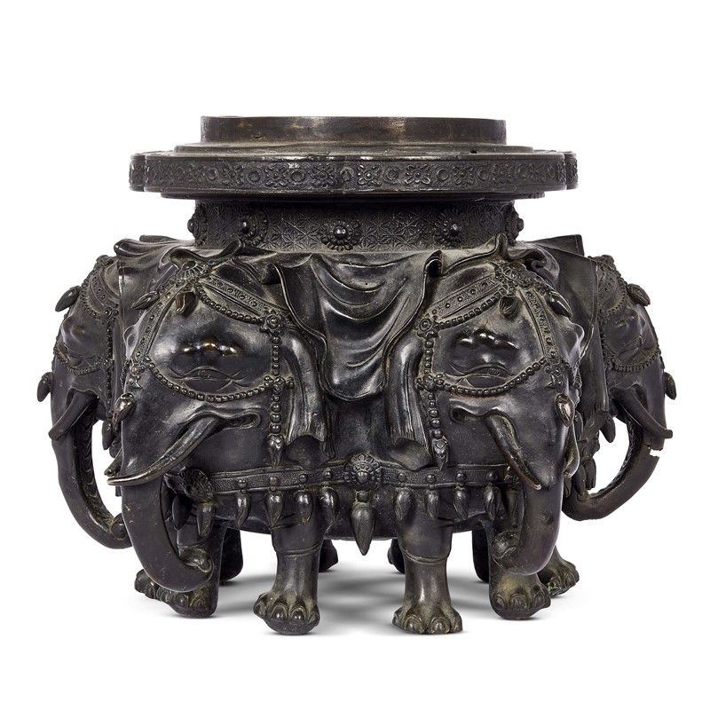 in bronzo brunito a forma di cinque elefanti adornati con Keyura.