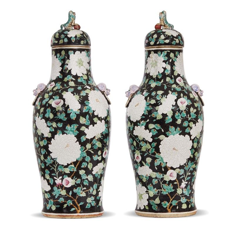 清 十九至二十世纪 墨地花卉纹兽衔环纹狮子滚球盖大瓶一对 高 68厘米
