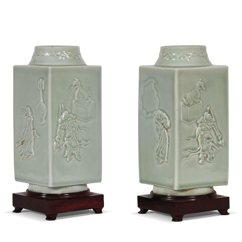 清 十九至二十世纪 龙泉青釉堆塑人物纹琮式瓶一对 高 26厘米