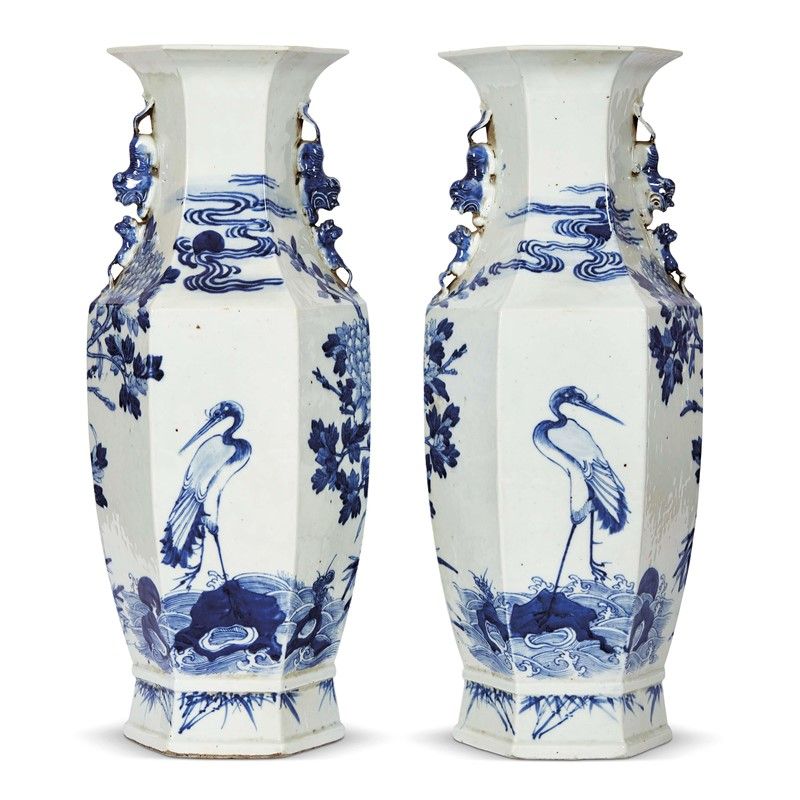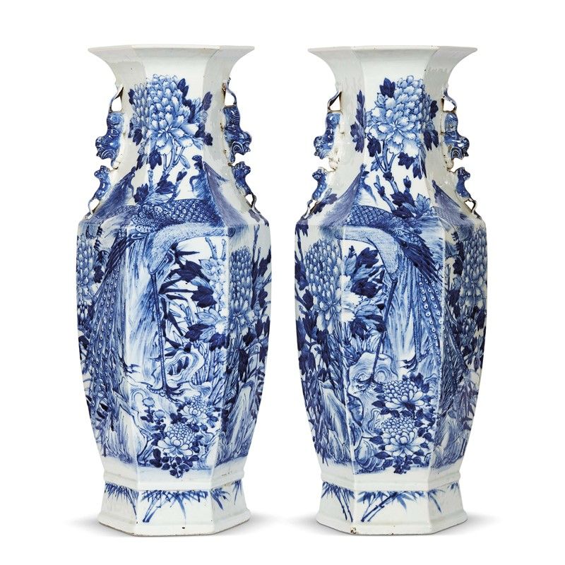 清 十九世纪 青花凤穿牡丹六方瓶一对 高 60厘米