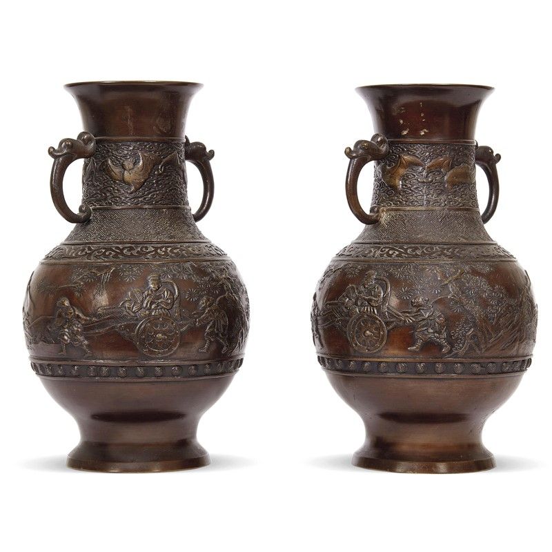 日本 明治 十九世纪 铜胎人物故事蝠云纹夔龙耳壶一对 高 30厘米