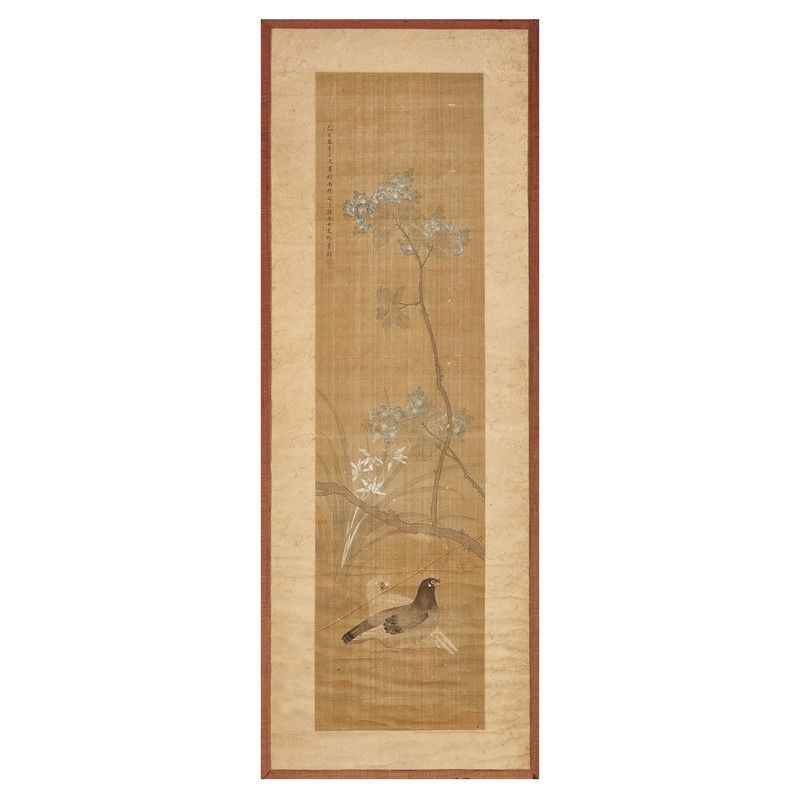 清 十九世纪 花鸟图 缪素钧款 纸本设色 尺幅 118x30厘米