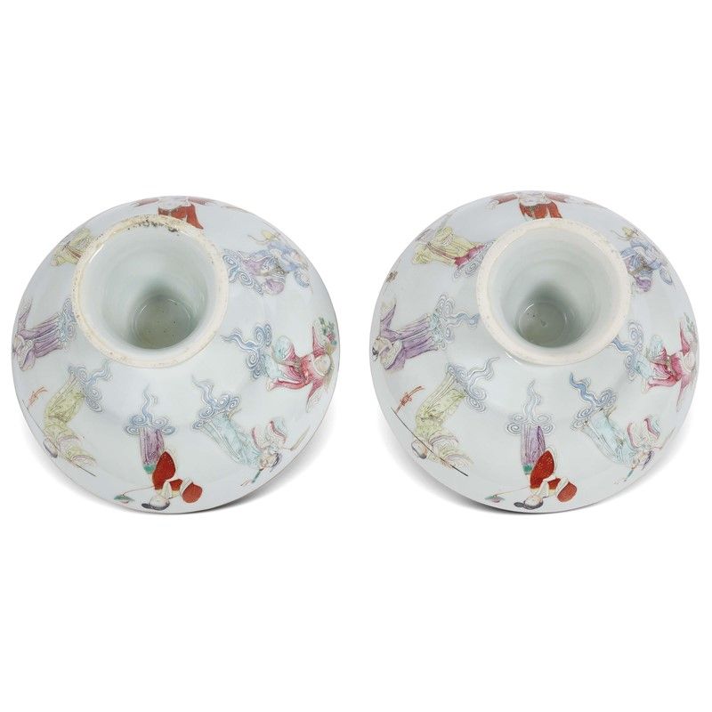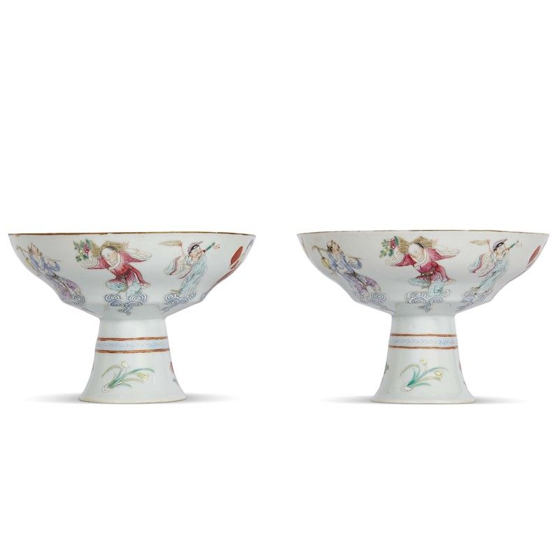 DUE COPPE CON PIEDE, CINA, DINASTIA QING, SEC. XX in porcellana policroma della famiglia rosa. Le figure rappresentano otto immortali che poggiano sopra le nuvole e i piedi delle coppe sono decorati con i fiori delle quattro stagioni. Alt. cm 9, Diam. cm 14,8 清 二十世纪 粉彩八仙驾云纹高足碗一组两件 高 9厘米 径 14.8厘米