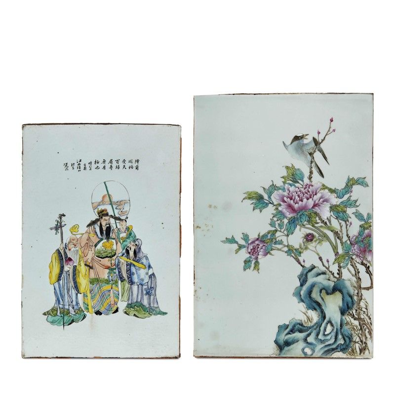 民国 1912至1949 粉彩福禄寿三星侍女图瓷板 牡丹花鸟瓷板 一组两件 尺幅 38,5x25,5厘米 尺幅 43,7x30厘米