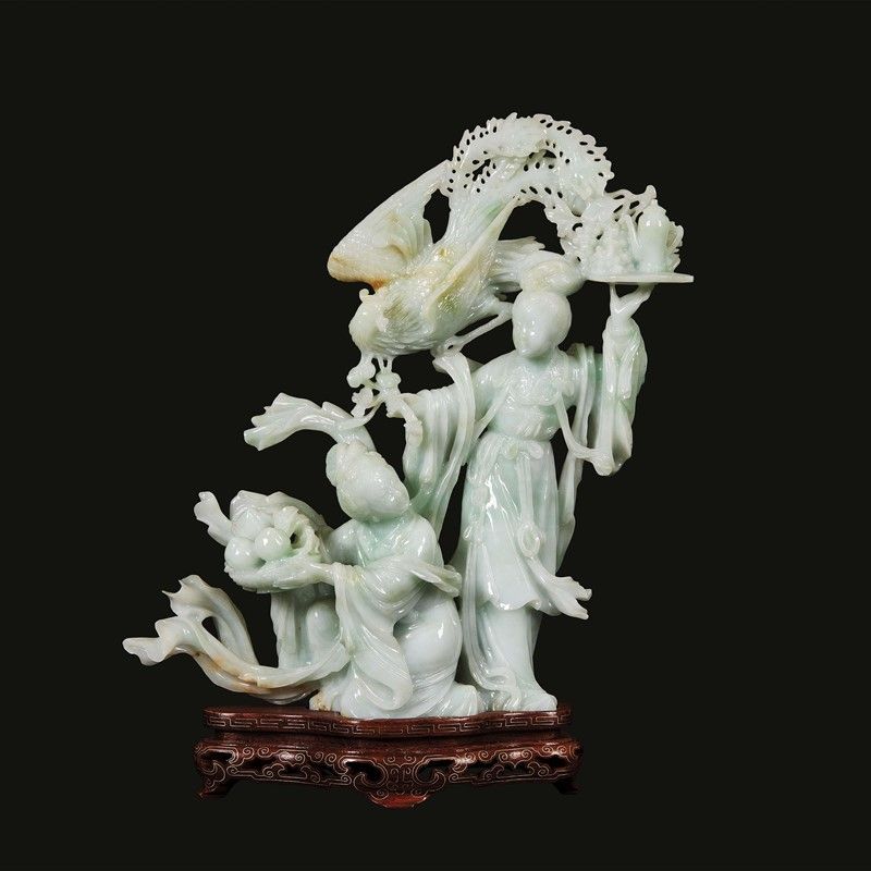 in giadeite bianca e verde su base in legno, raffigurante due divinità e una fenice.