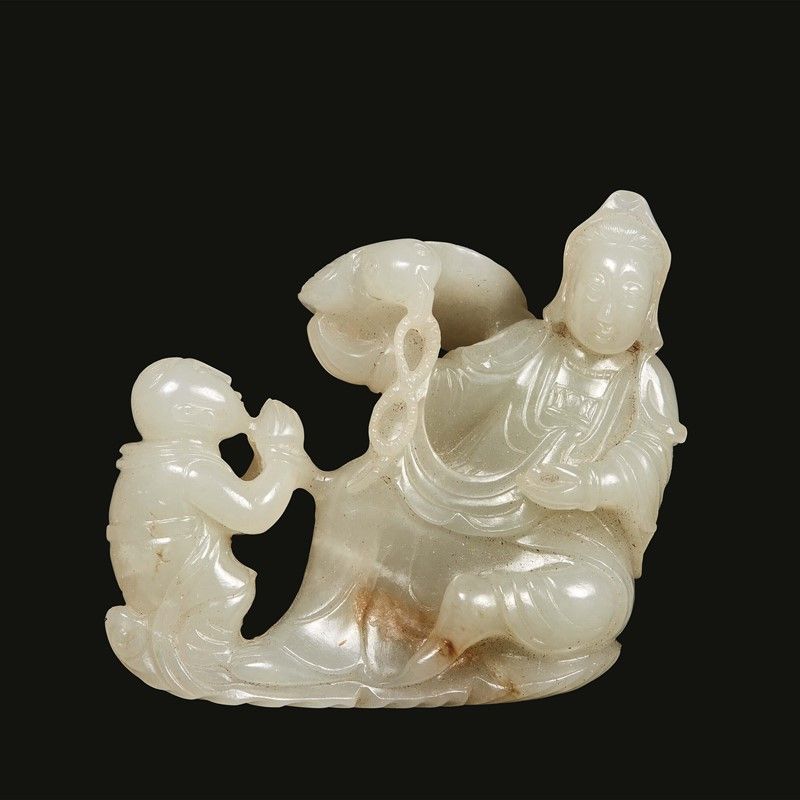 in giada bianca, raffigurante un bambino che sta pregando Guanyin, il quale tiene sulla mano destra un’aquila.