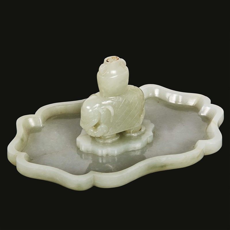 In giada bianca verde, il piatto a forma Ruyi presenta un elefante al centro, su cui è posto un vaso in segno di pace e ricchezza.