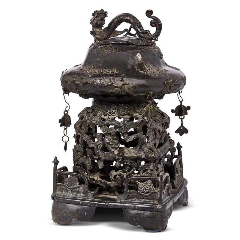in bronzo brunito, raffigurante un drago e delle nuvole.