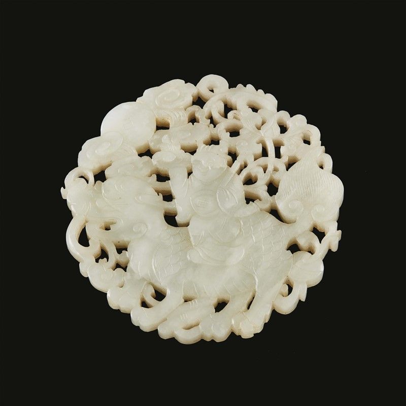 in giada bianca su cui è inciso il ragazzo cava Qilin che va verso il sole.